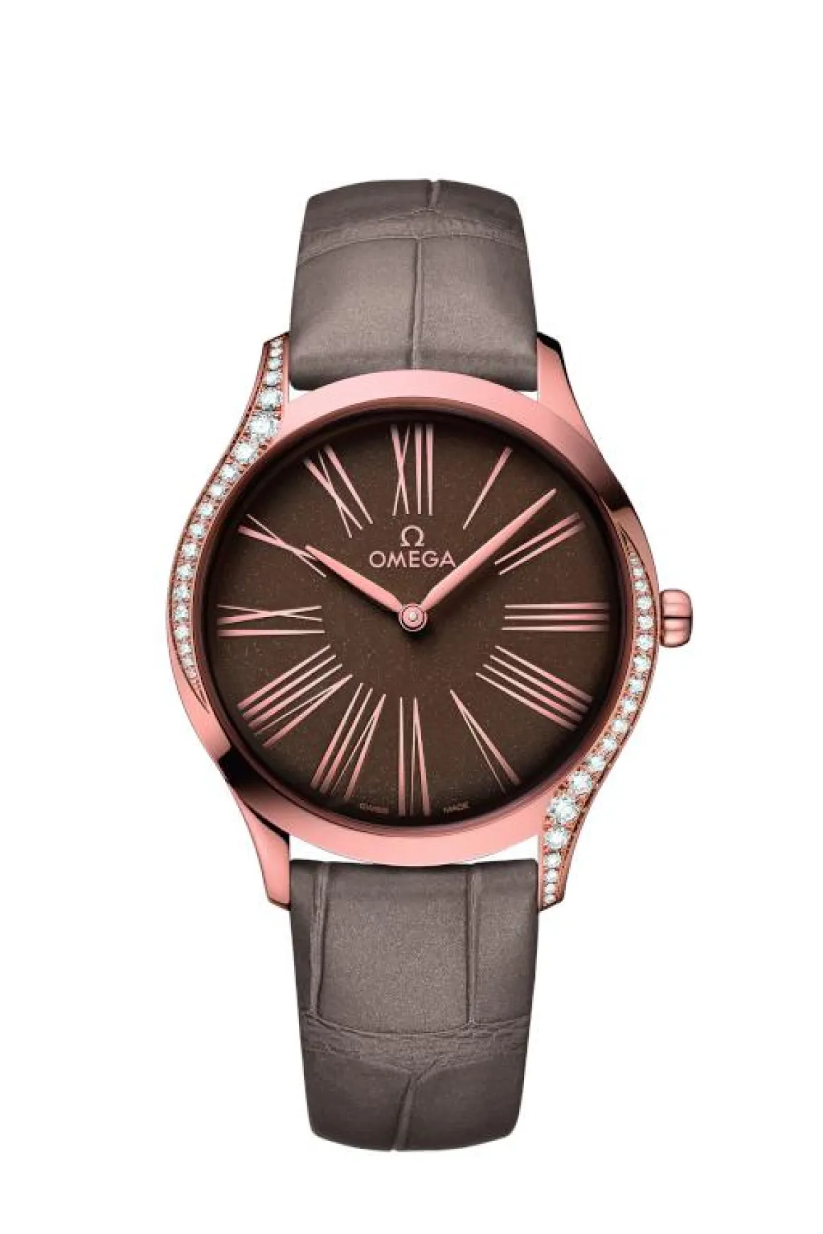 ومن الساعات التي لفتت نظرنا هذا العام أيضاً، ساعة دو فيل تريزور De Ville Tresor من أوميغا Omega والتي قدّمتها الدار بقالب فنيّ مبتكر، وهي مصنوعة من الذهب الوردي ومرصّعة بأحجار الماس، مع سوار من جلد التمساح الطبيعي.