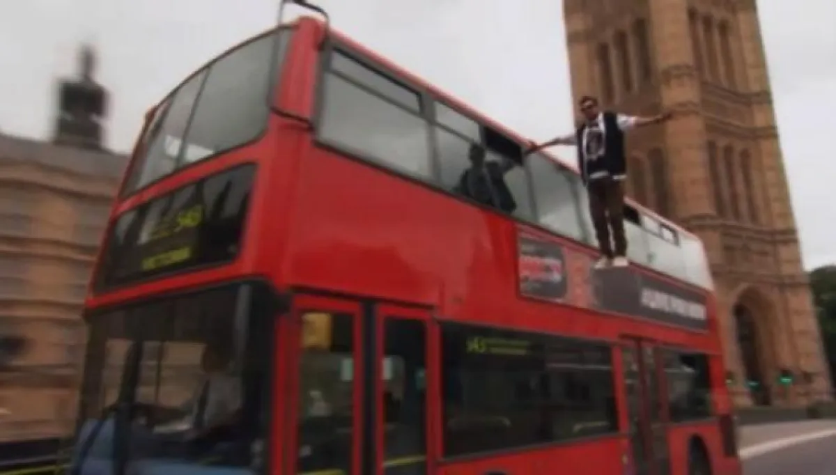 أذهل ستيفن فريني الملقّب بـ"دينامو" المارة في شوارع لندن، ببقائه معلّقاً بيد واحدة على سقف حافلة لندن الشهيرة ذات الطابقين.