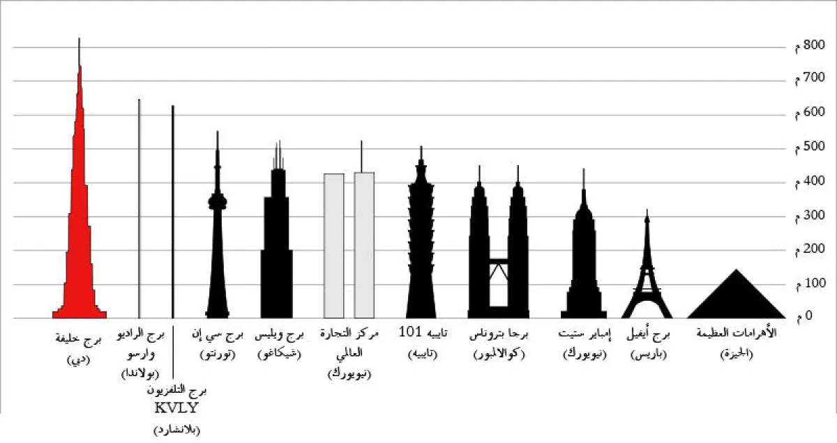 ارتفاع برج خليفة بالنسبة إلى أعلى المباني في العالم
