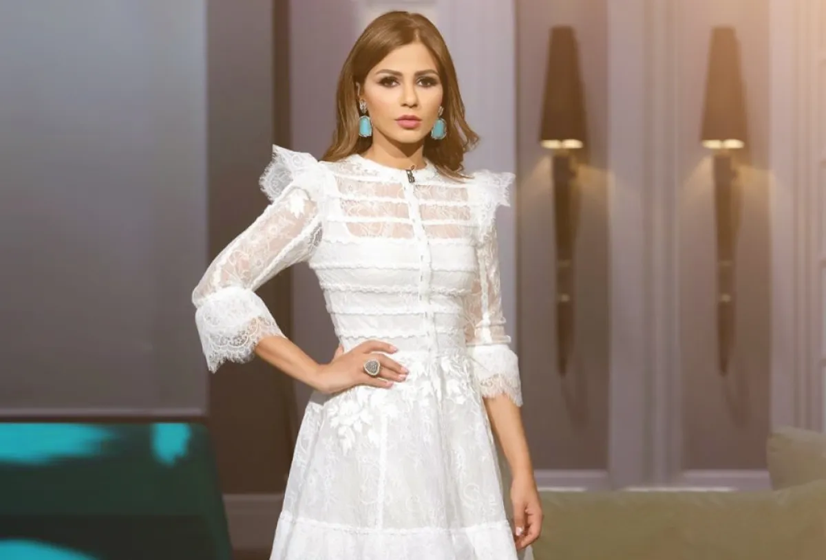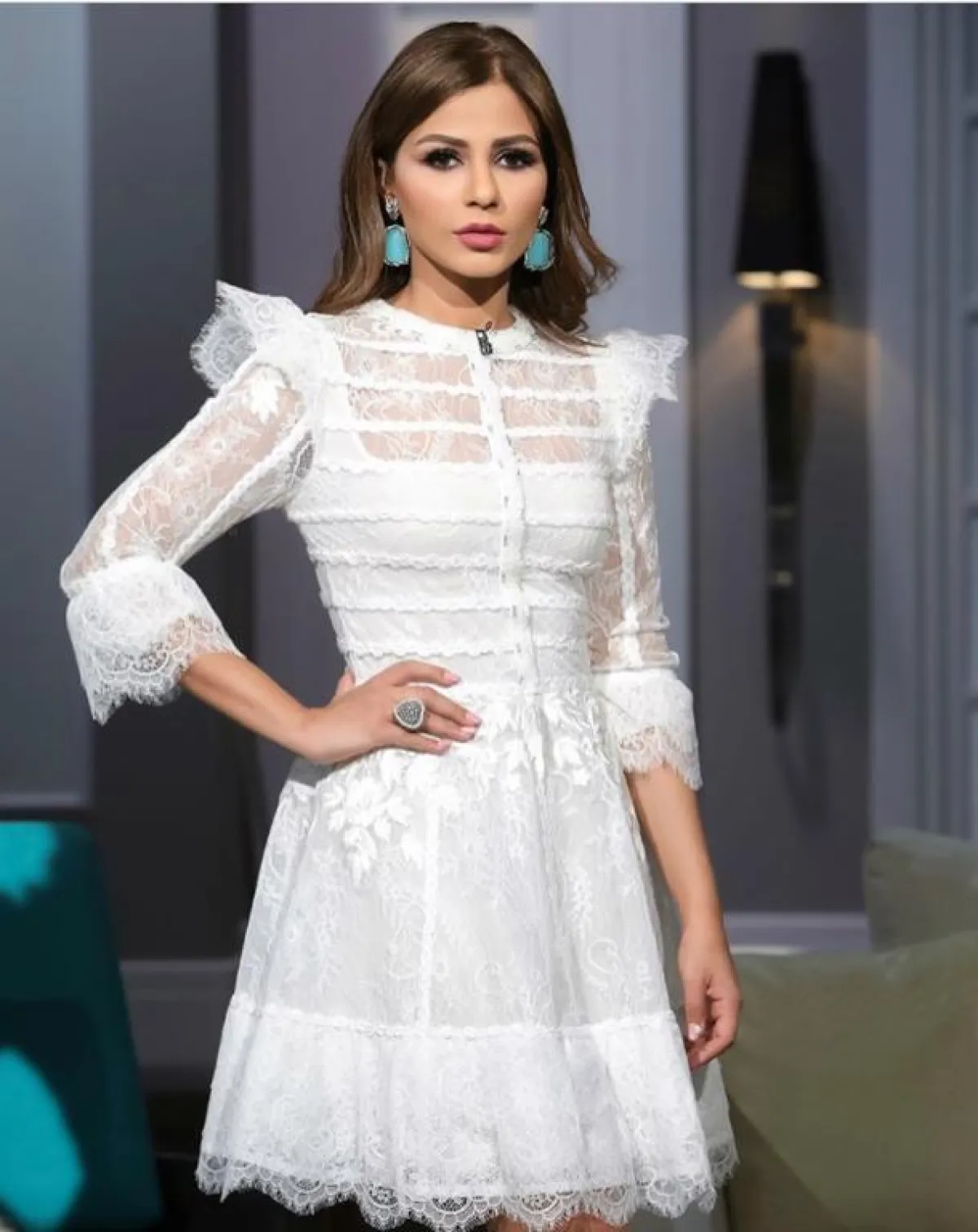 اطلالة أنثوية مشرقة يمكنكِ اتّباعها على طريقة الإعلامية مهيرة عبد العزيز، التي ارتدت فستانًا من الدانتيل الأبيض بأكمام ميدي، وكشكش على الأكتاف، نسقته مع أقراط كبيرة باللون الفيروزي، وخاتم كبير، واعتمدت مكياج عيون قويًّا نوعًا ما، أبرز جمال عينيها.