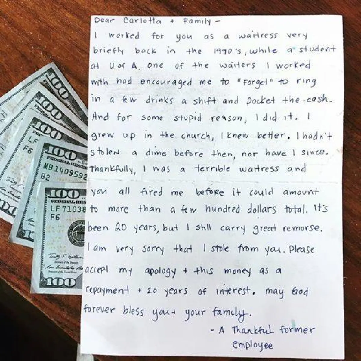 حادثة نادرة شهدتها ولاية أريزونا الأمريكية وكشفت عنها كارلوتا فلوريس مالكة مطعم مكسيكي، بعد أن تلقت رسالة اعتذار من امرأة مجهولة، تقول إنها كانت تعمل في مطعمها قبل أكثر من عقدين من الزمن، وسرقت مبلغًا من المال لتمويل دراستها.