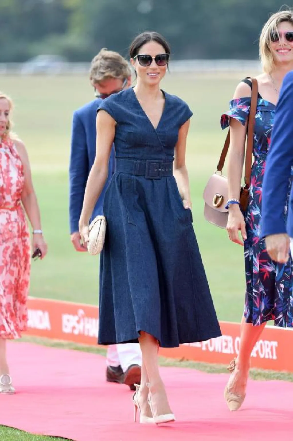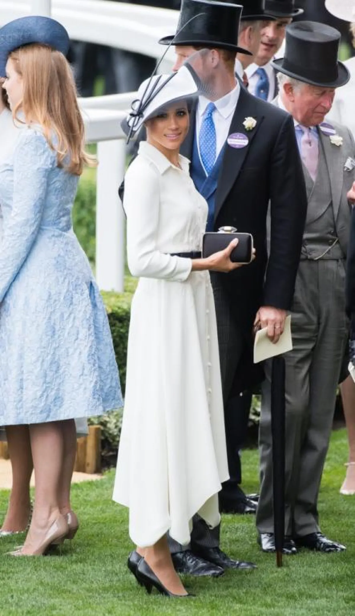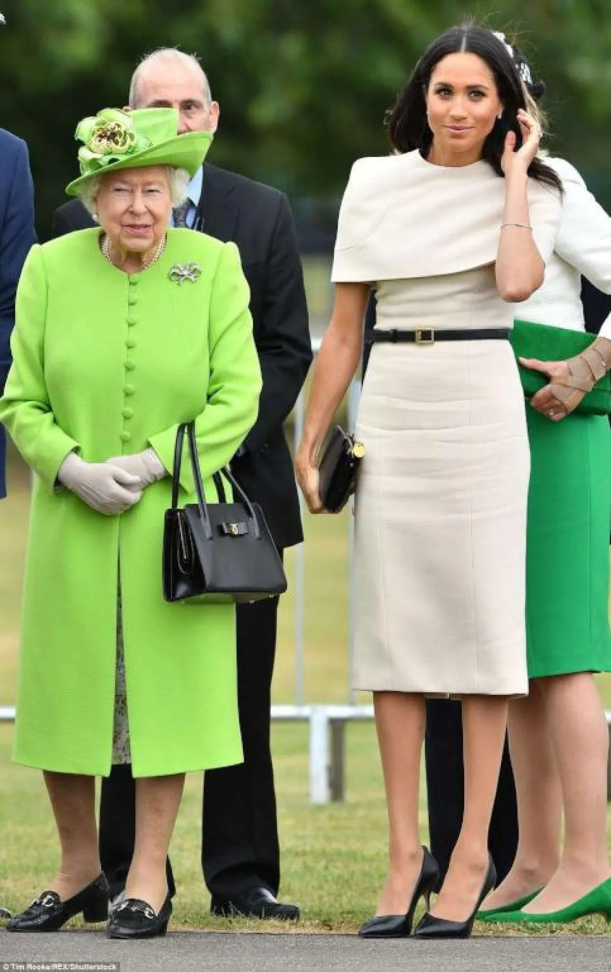 اختارت ميغان Meghan لأول مشاويرها الخاصة مع الملكة، فستان ميدي باللون البيج الفاتح من جيفنشي، له قصة الكايب عند الأكتاف، مزيّنًا بحزام أسود على الخصر، وقد نسقت معه اكسسوارات ناعمة وأنيقة.