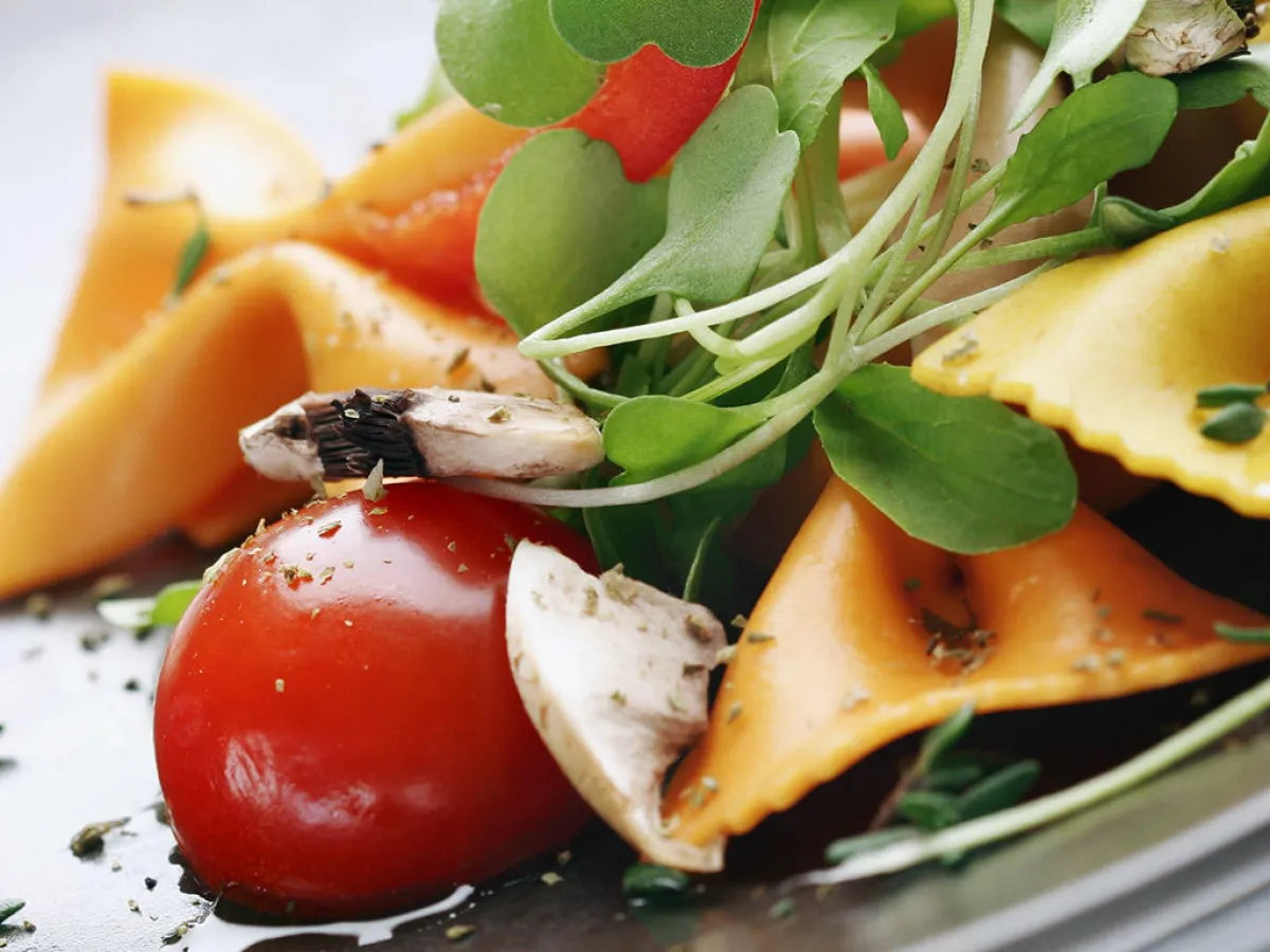 2-يُقطّع الفطر أنصافاً بعد غسله ويوضع فوق الروكا.