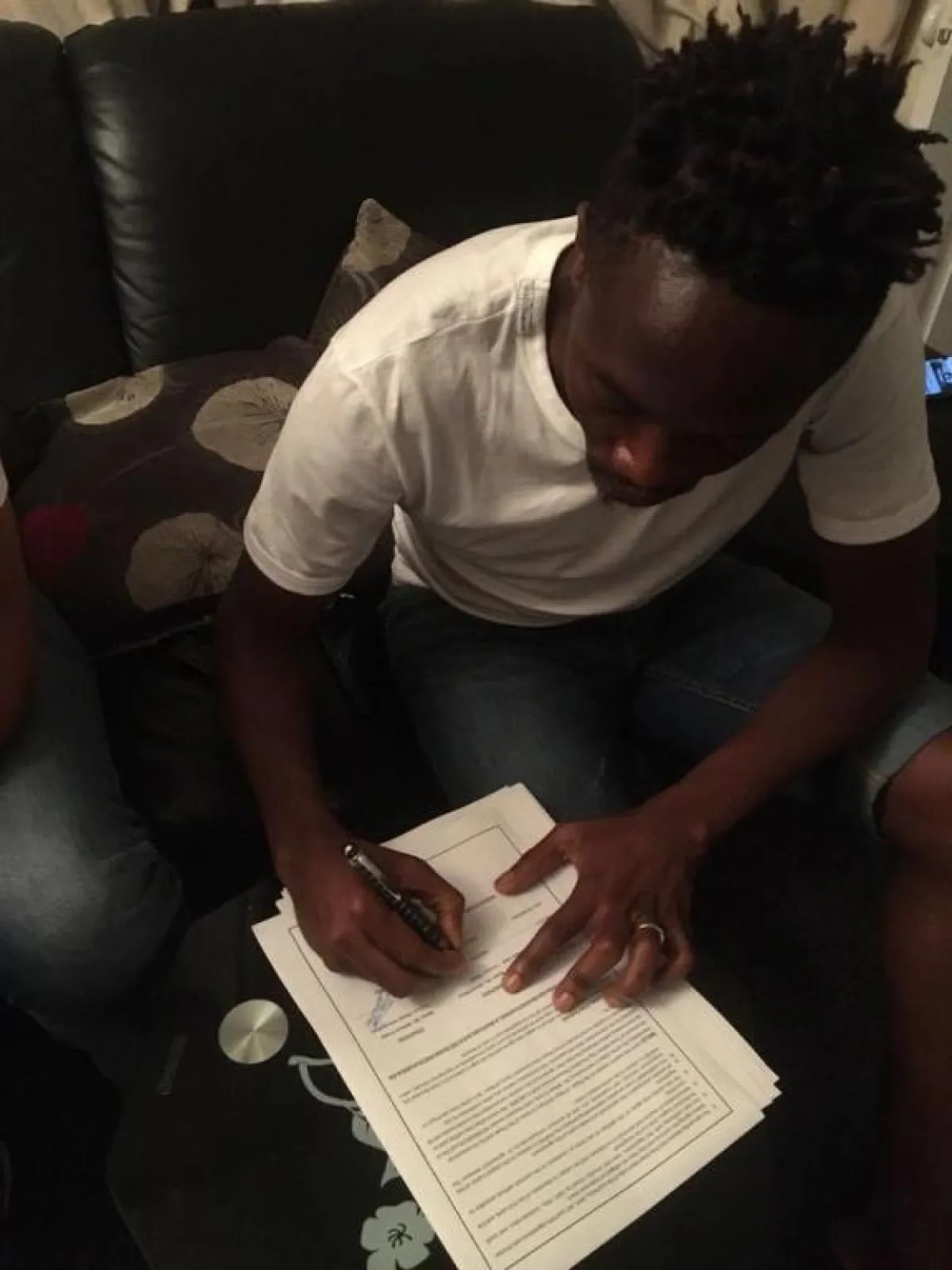 وقد أُعلن توقيع اللاعب العقد بطريقة مبتكرة، حيث تظهر في المقطع المصور طائرة ستقلع من بريطانيا إلى ملعب نادي النصر، ثم يظهر في الفيديو اسم اللاعب.