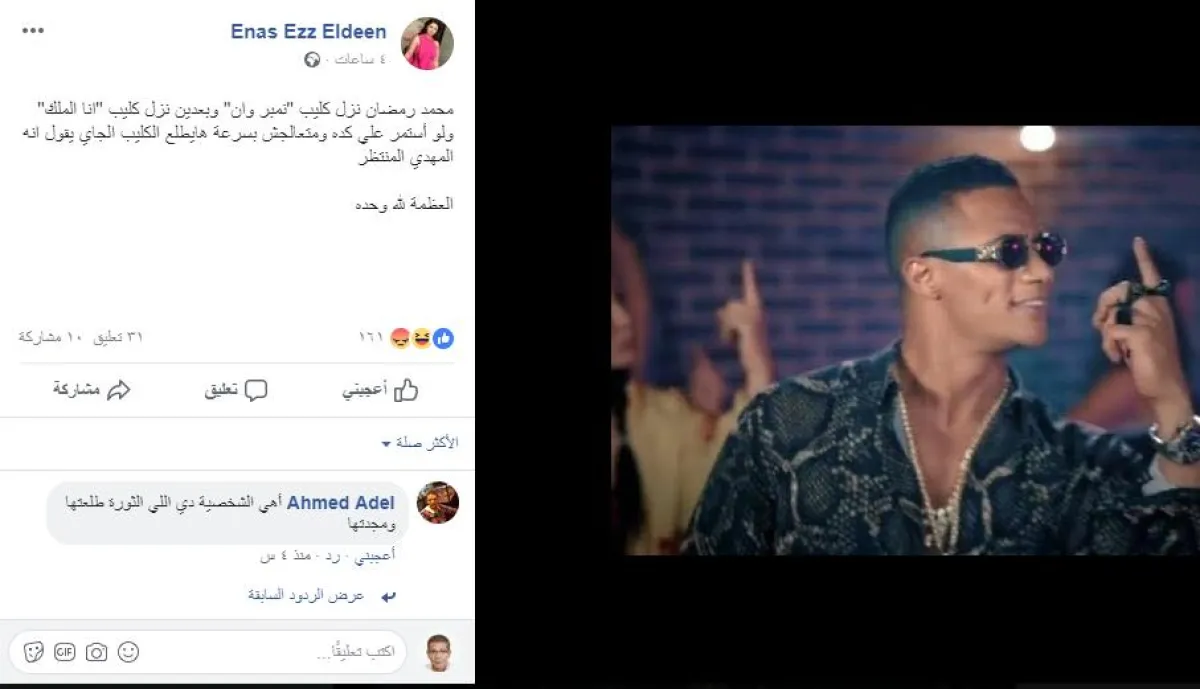 وقالت نجمة الموسم الأخير من برنامج "آراب أيدول" إيناس عز الدين: "محمد رمضان نزل كليب "نمبر وان" وبعدين نزل كليب "أنا الملك" ولو أستمر على كده ومتعالجش بسرعة هايطلع الكليب الجاي يقول انه المهدي المنتظر العظمة لله وحده".