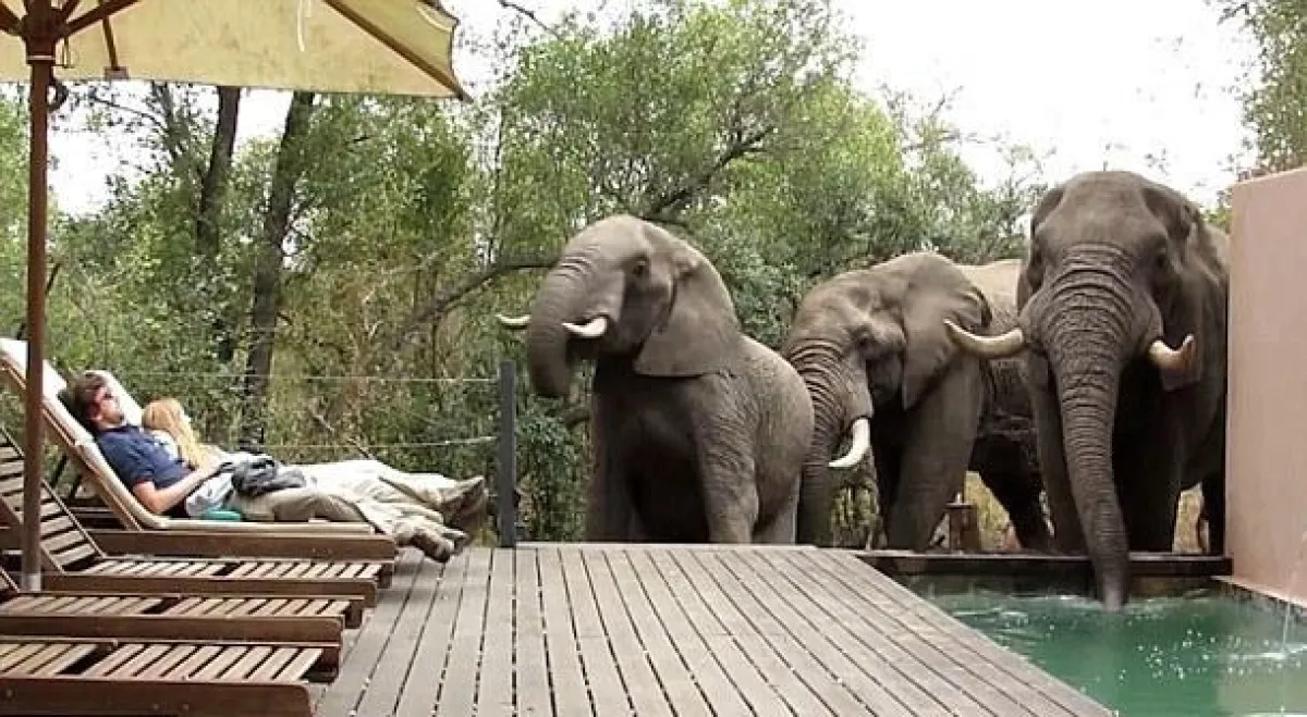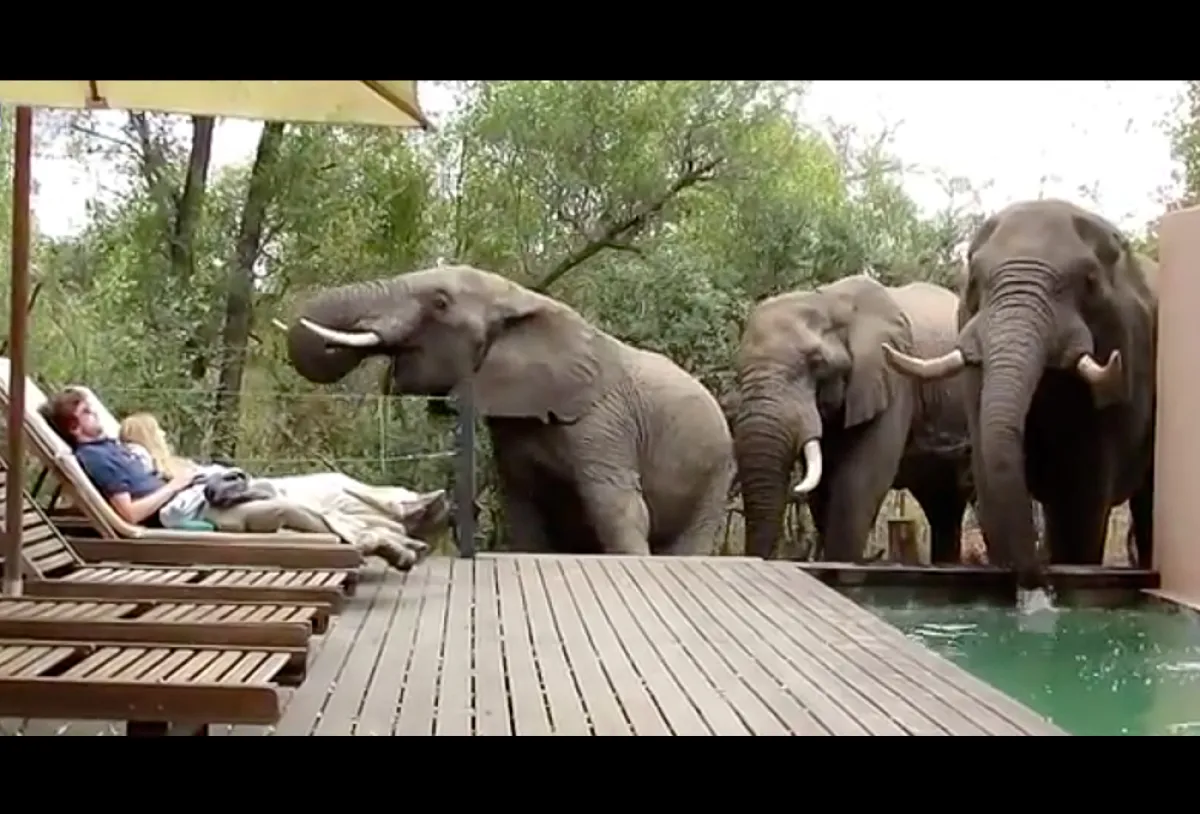 أثناء استجمامهما أمام حمام السباحة تفاجآ زوجان بدخول ثلاثة أفيال إلى المسبح، وقيامها بالشرب منه ثم المضي إلى موطنها.