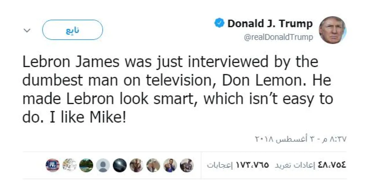 ويُشار إلى أن الرئيس الأمريكي "دونالد ترامب"، كان قد أهان "ليبرون جيمس" خلال الأيام القليلة الماضية، عبر تغريدة له على صفحته الرسمية عبر موقع "تويتر" جاء فيها: "لقد كان الذي حاور ليبرون جيمس، أكثر المقدمين غباء، (دون ليمون)، جعل جيمس يبدو ذكياً، وهذه مهمة ليست بالسهلة"، حيث كان "ترامب" قد أشار في تغريدته إلى أنه يفضل أسطورة كرة السلة المعتزل "مايكل جوردان"، على مواطنه جيمس الذي يضعه البعض في المرتبة نفسها مع جوردان، لما يقدمه من أداء مميز وفريد في اللعبة الأهم في الولايات المتحدة الأمريكية.