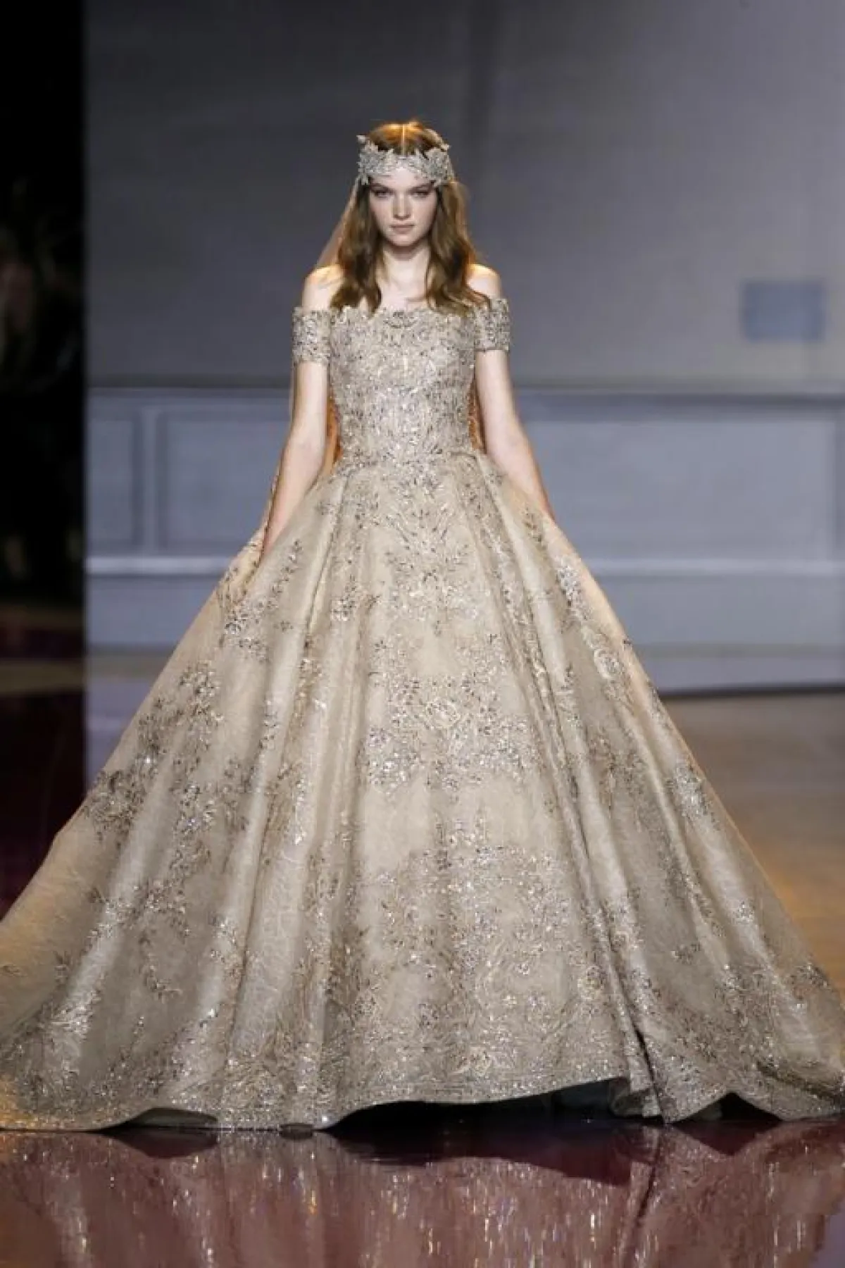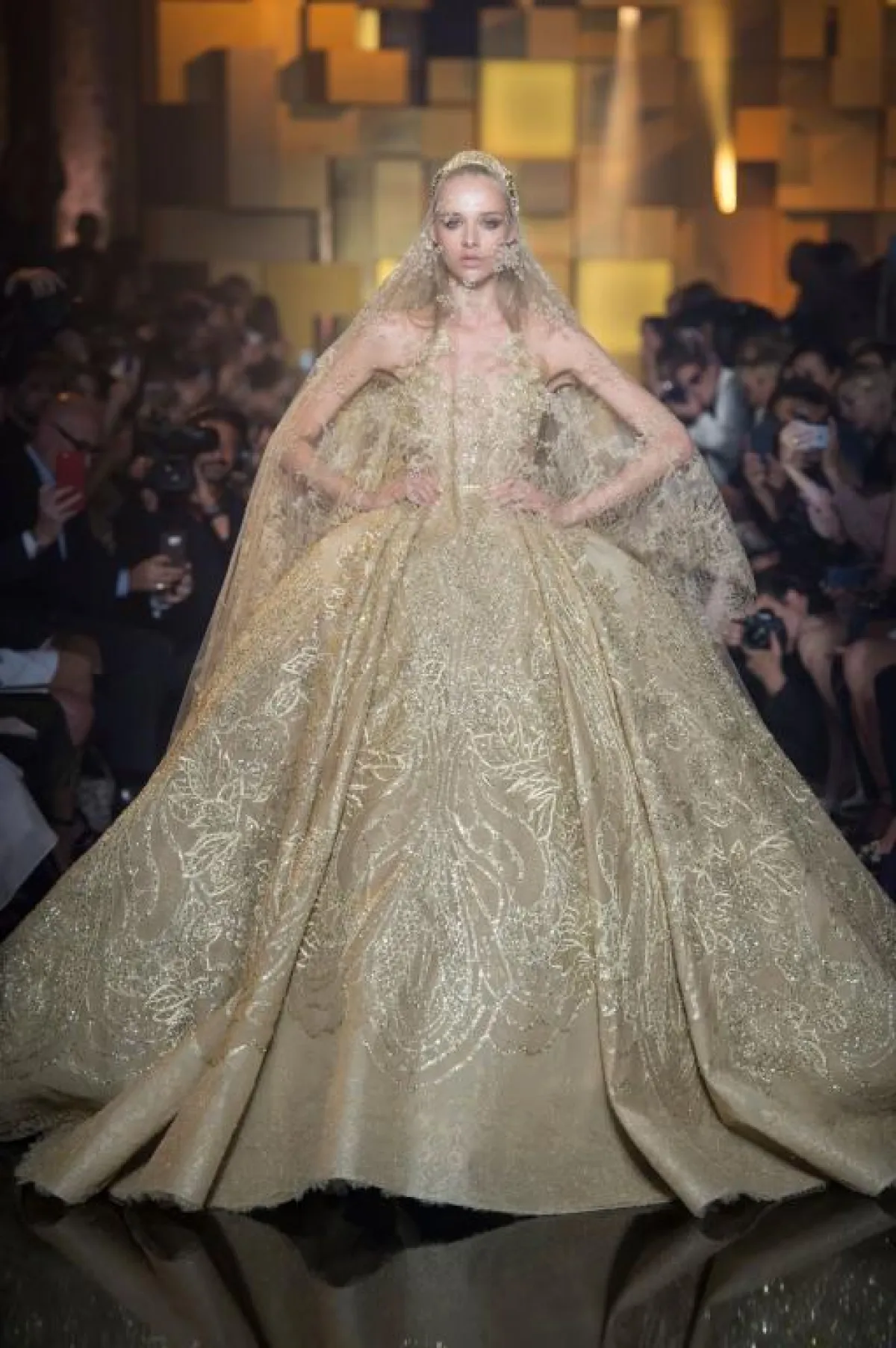 ولنفس الموسم، فاجأنا المصمم اللبناني إيلي صعب بتخليه عن اللون الأبيض وتقديم فستان زفاف ذهبي ومرصع بالفصوص البرّاقة.