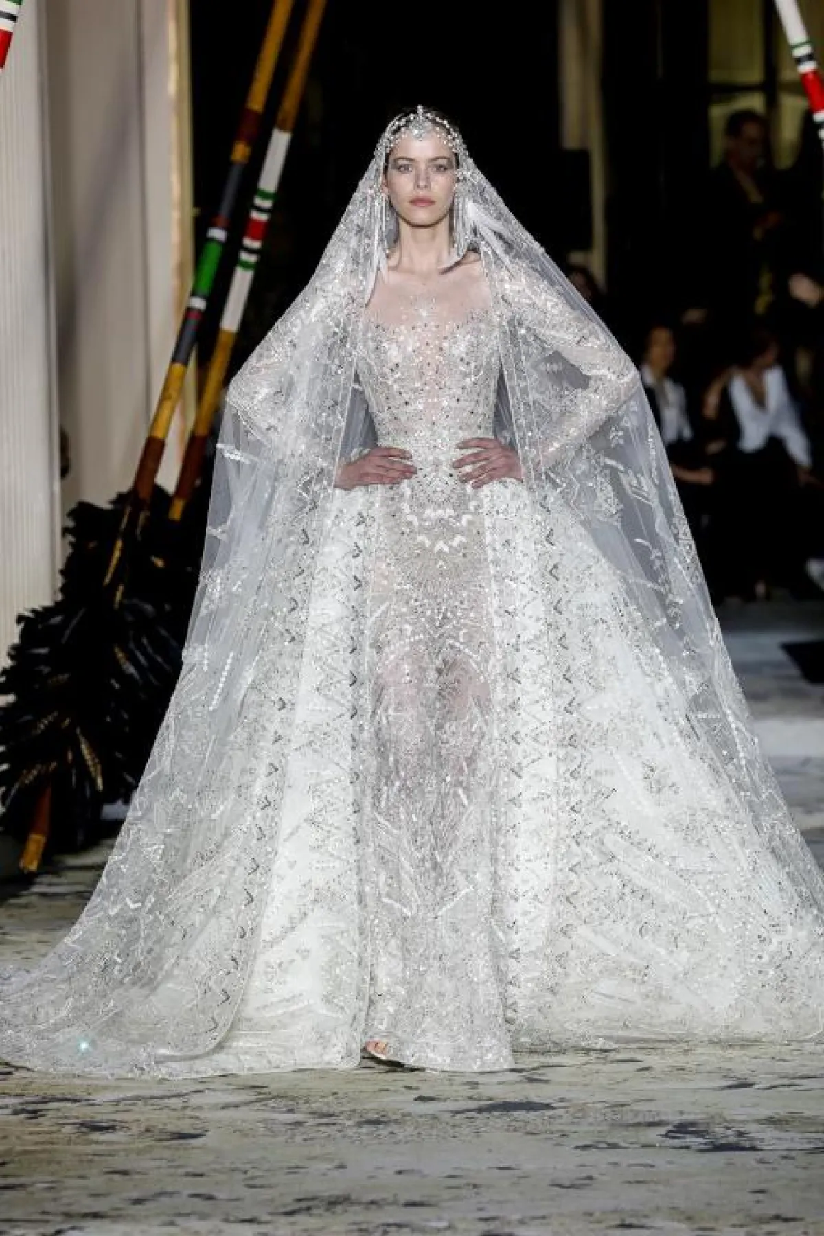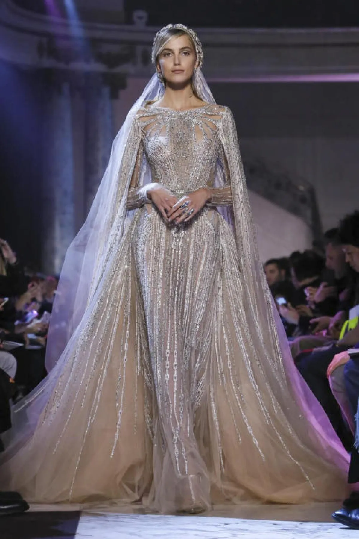 كذلك قدم إيلي صعب فستان زفاف مبهراً بتصميم يبرز انحناءات الجسم مع تنورة إضافية وتزين بالخطوط البرّاقة مع صيحة الكاب الرائجة والطرحة الطويلة المرصعة بتطريزات الفستان نفسها.