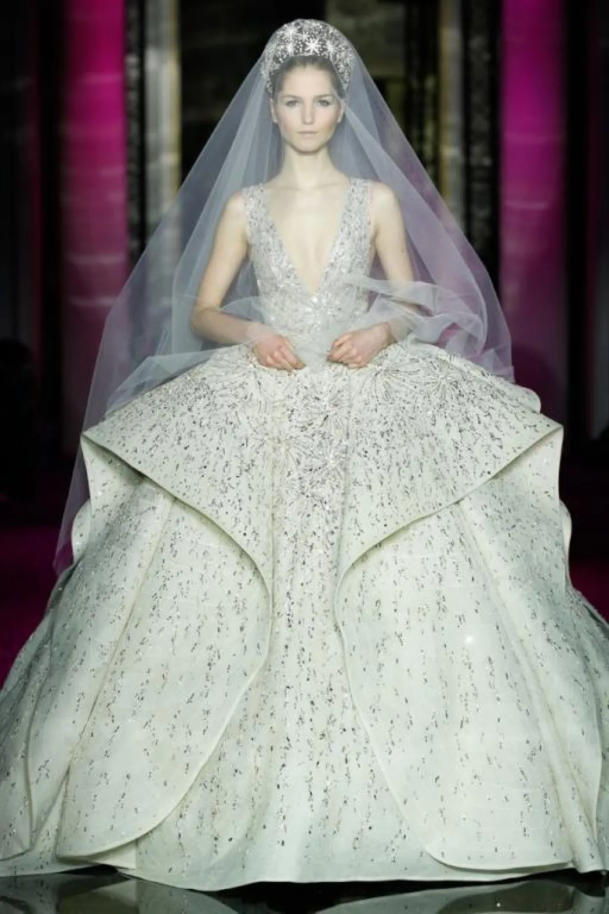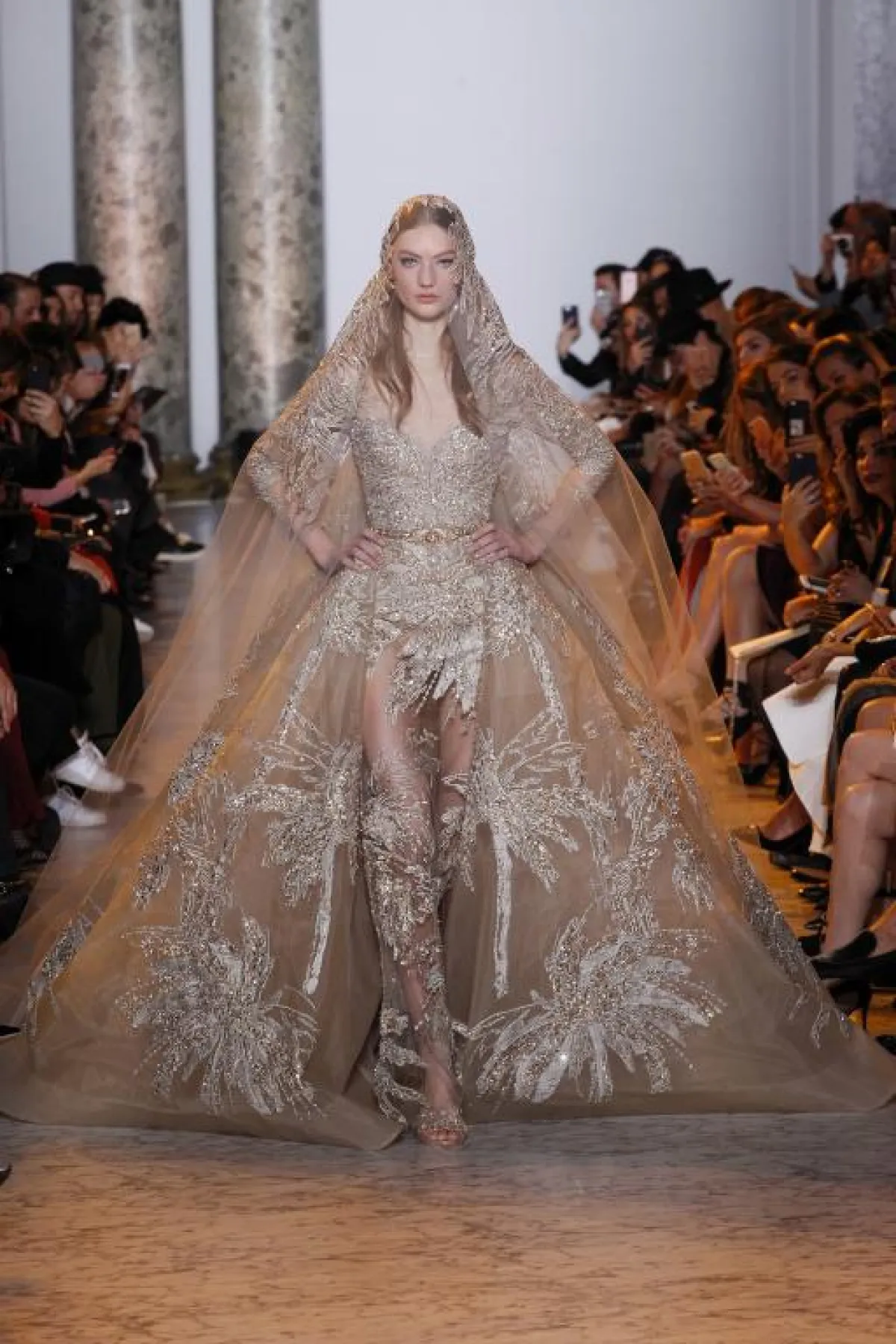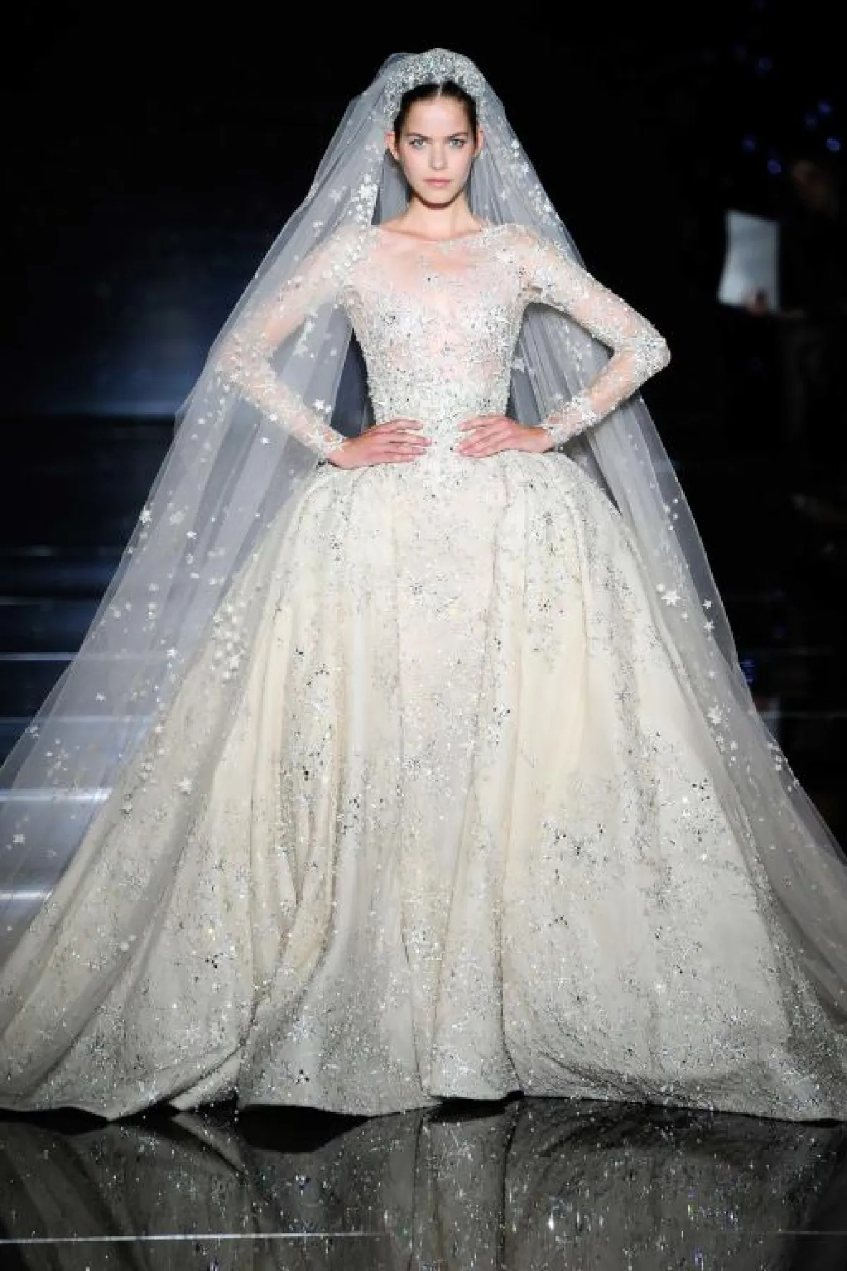 وخلال الموسم نفسه، قدم إيلي صعب فستان زفاف بقماش شفاف ومرصعاً ببريق يخطف الأنفاس مع تنورة إضافية وحزام ذهبي حول الخصر.