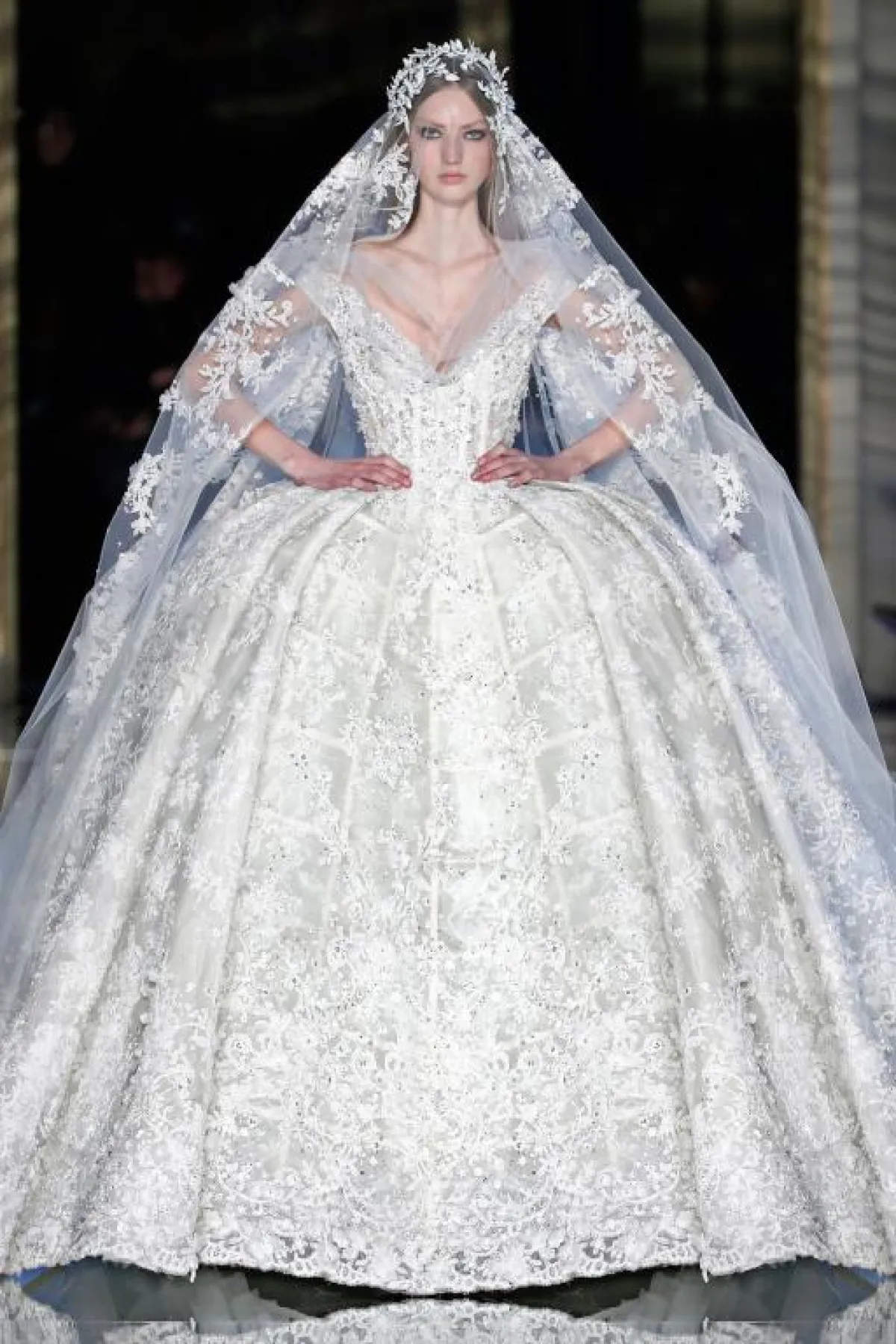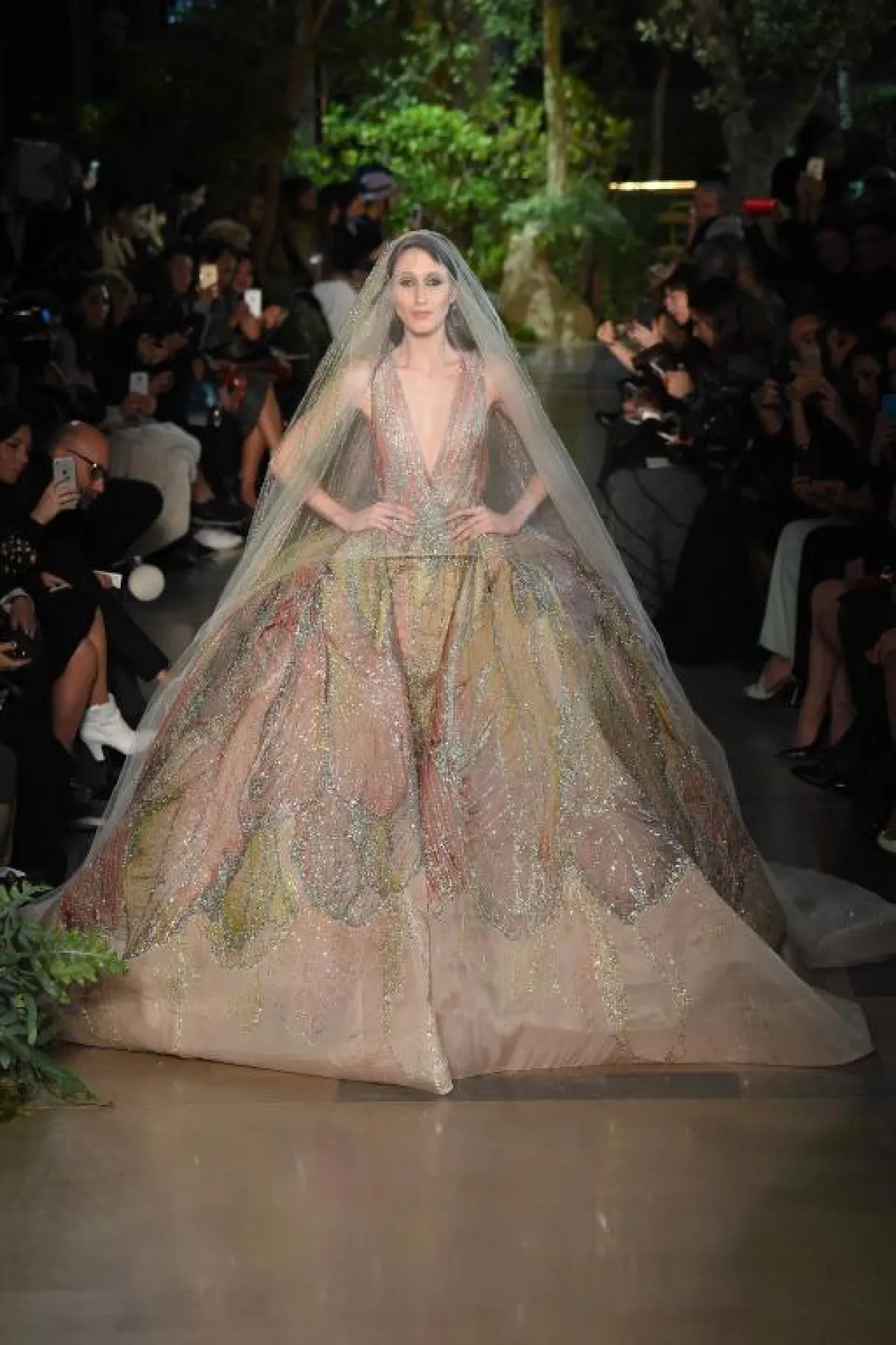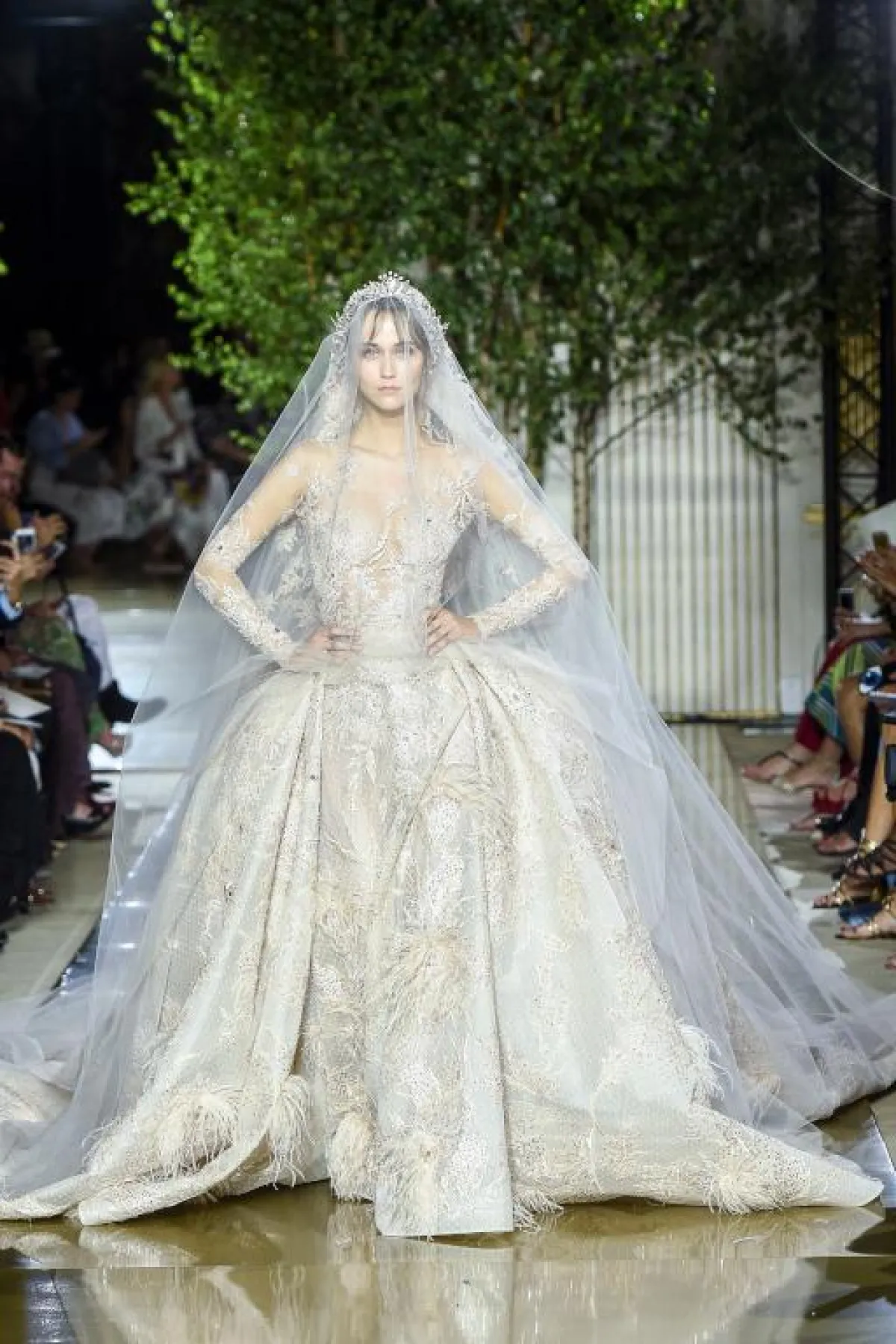 أما المصمم إيلي صعب، فقد عاد إلى البساطة في هذا الموسم، وقدم فستان زفاف يحاكي الأميرات في القصور الملكية مع أسلوب جديد في ارتداء الطرحة التي تنسدل على الشعر، وتميز الفستان بتصميمه الناعم والمحتشم مع تطريزات برّاقة.
