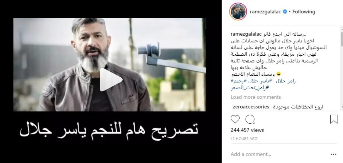 وعلق رامز جلال على المقطع الصوتي قائلًا: رسالة إلى أجدع فانز.. أخويا ياسر جلال مالوش أيّ حسابات على السوشيال ميديا، وأيّ حد يقول حاجة على لسانه، فهي أخبار مزيفة، وعلى فكرة دي الصفحة الرسمية بتاعتي: رامز جلال، وأيّ صفحة تانية ماليش علاقة بيها. ومساء النعناع الأخضر".