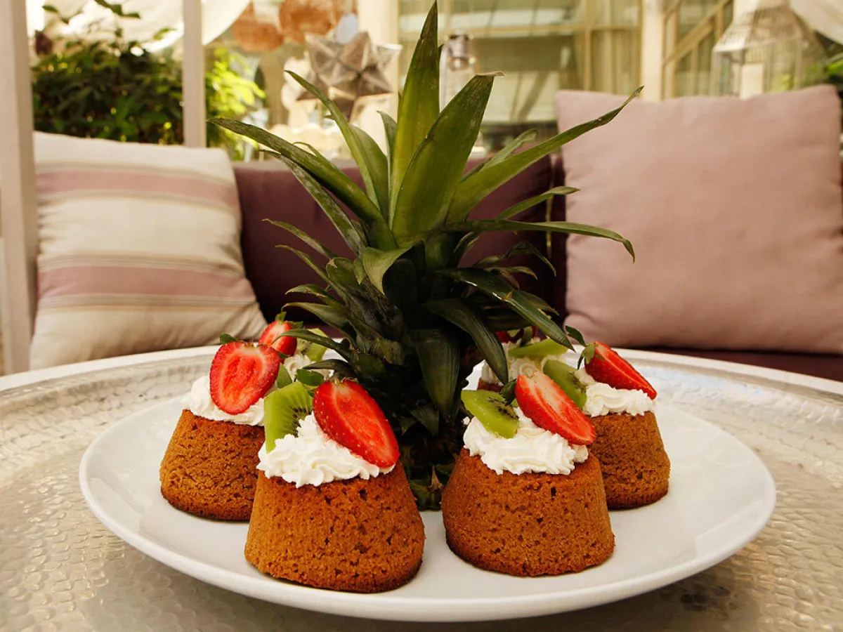 4 ـ عندما تبرد الصينيّة، تُزيّن بقطع الأناناس والفراولة والكيوي.