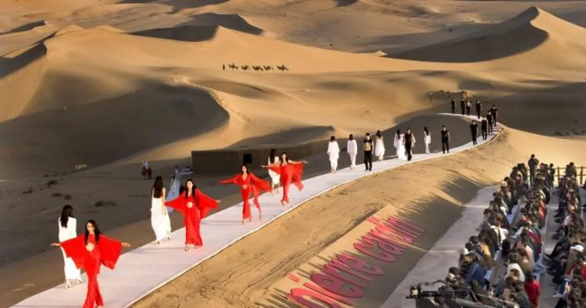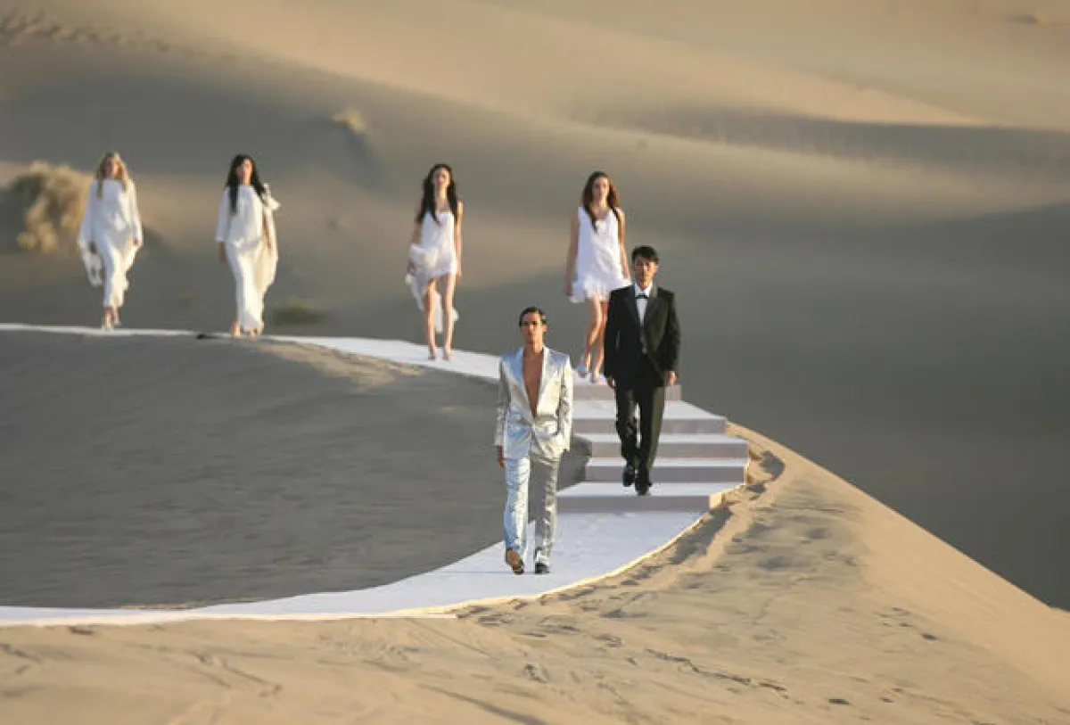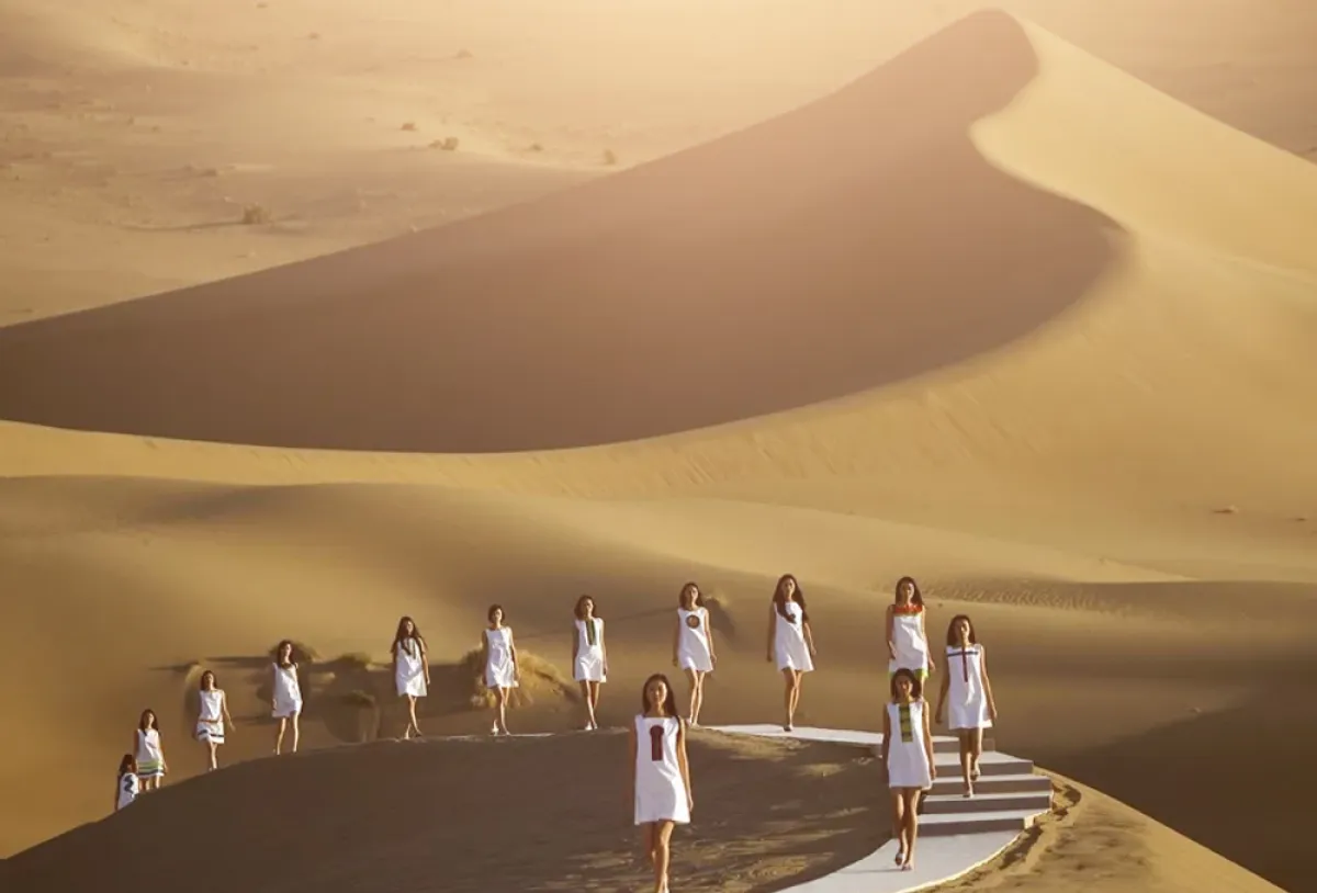 يستحق عرض الأزياء هذا لصاحبة بيري كاردين أن يكون ضمن قائمة عروض الأزياء الأكثر غرابة، حيث أقيم العرض بالكامل في صحراء مينغ شان.
