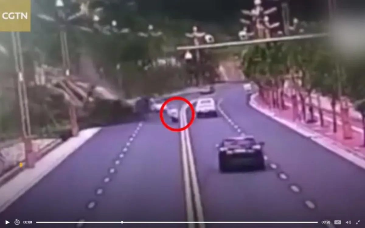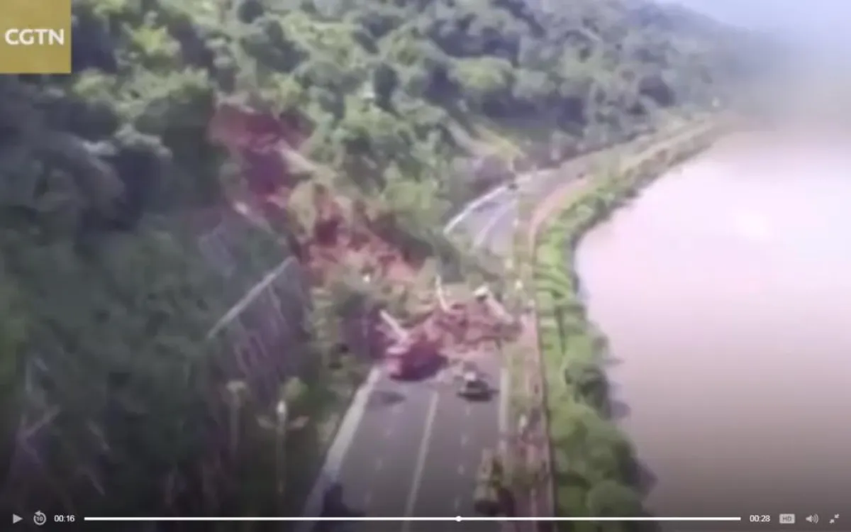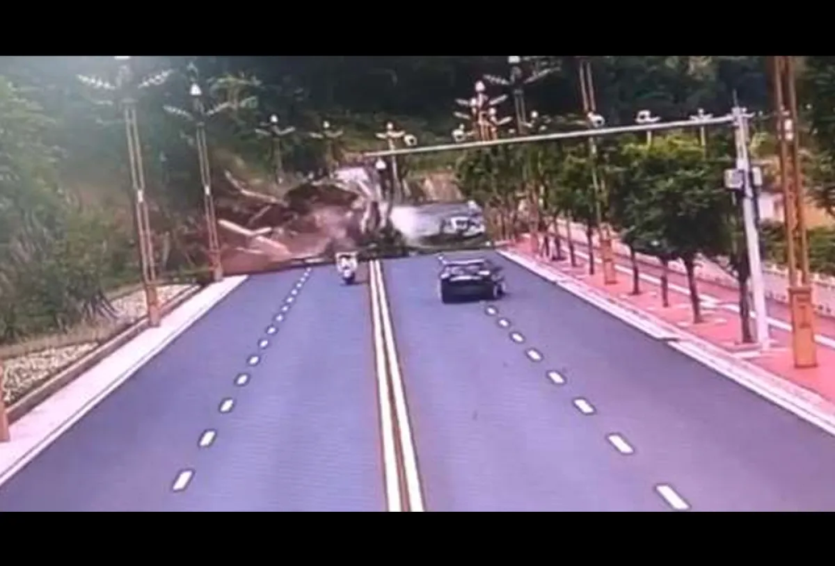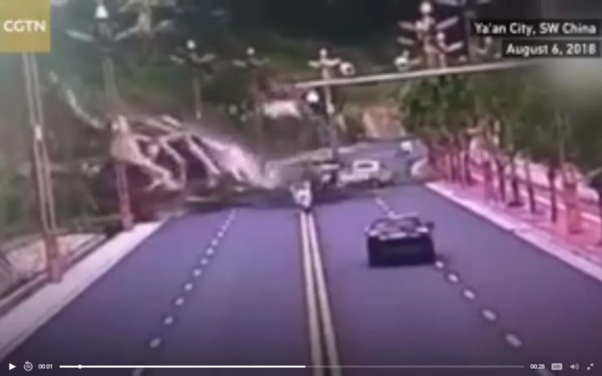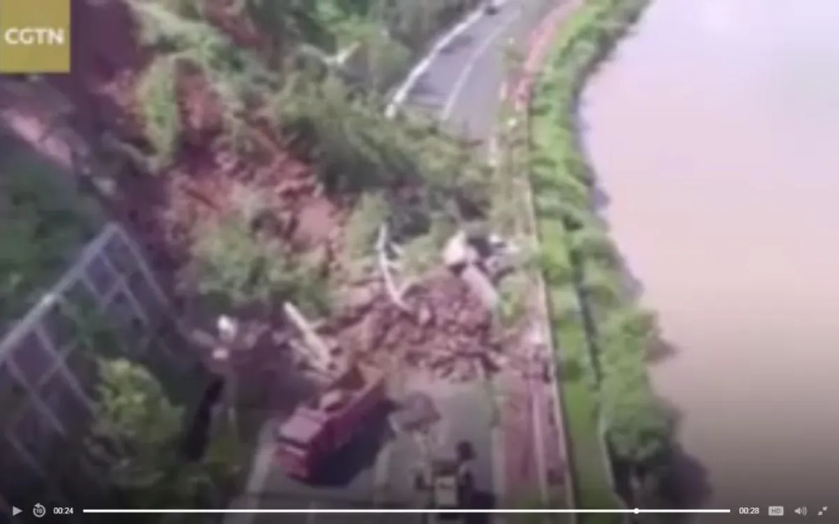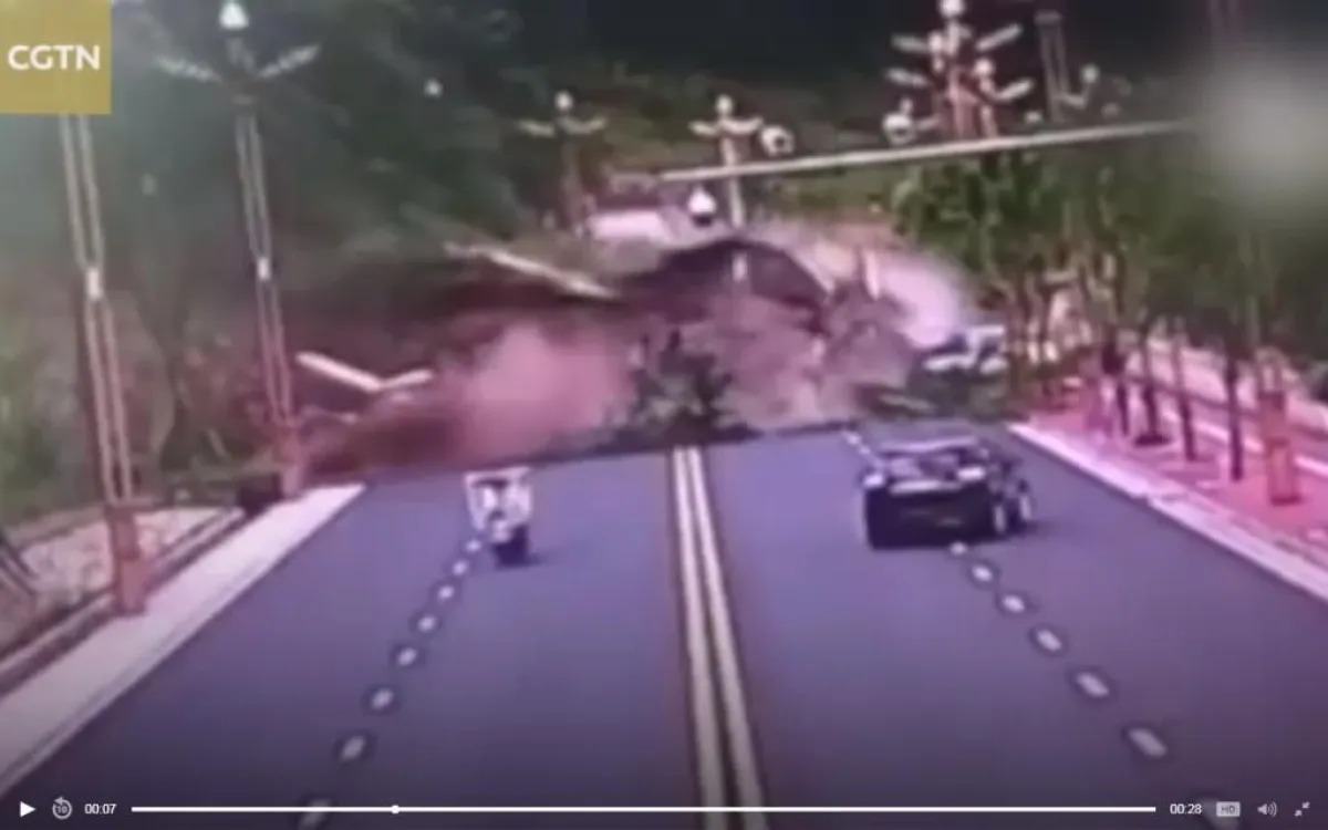 فقد نقل موقع «CGTN» لحظة انهيار جانب جبلي على الطريق في مقاطعة سيتشوان جنوب غرب الصين؛ نتج عنه دفن الجبل لشاحنة واثنتين من الدراجات البخارية، وقد أُصيب شخص واحد من هذا الانهيار.