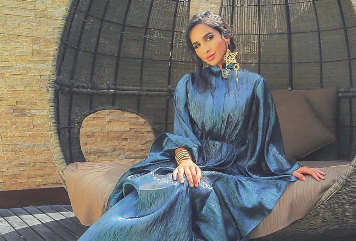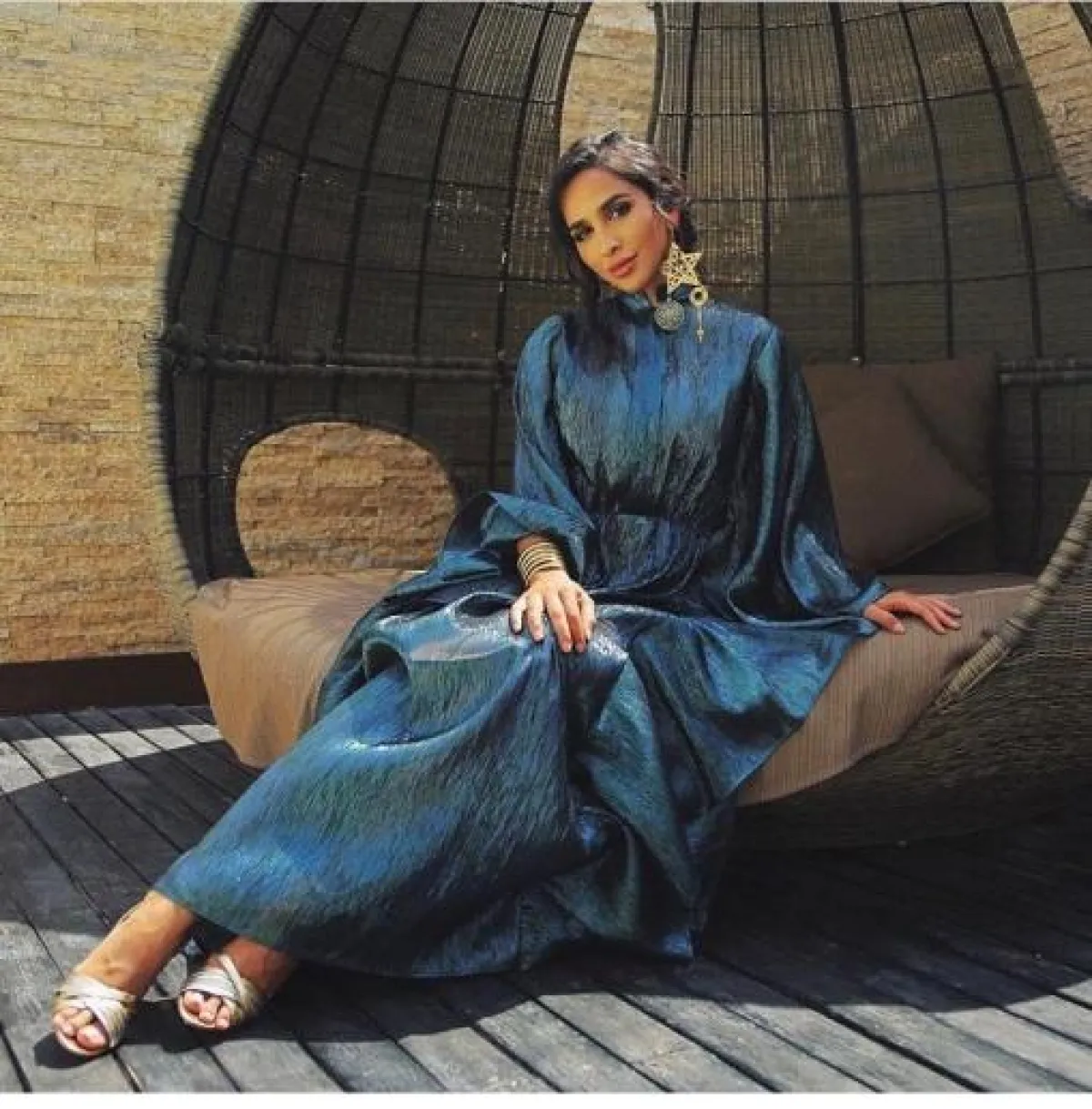 لمناسباتك الليليّة الخاصّة بعيد الأضحى يمكنك ارتداء القفطان على طريقة المدوّنة سعودية الأصل هلا. اختارت هلا لإطلالة ليليّة ساحرة قفطان راقي على شكل فستان ذي ياقة عالية وحزام، من القماش الحريريّ المتماوج. وقد مزجت معه إكسسوارات بسيطة اقتصرت على أقراط ذهبية كبيرة بشكل نجمة، وحذاء جلديّ ذهبيّ أنيق بكعب.