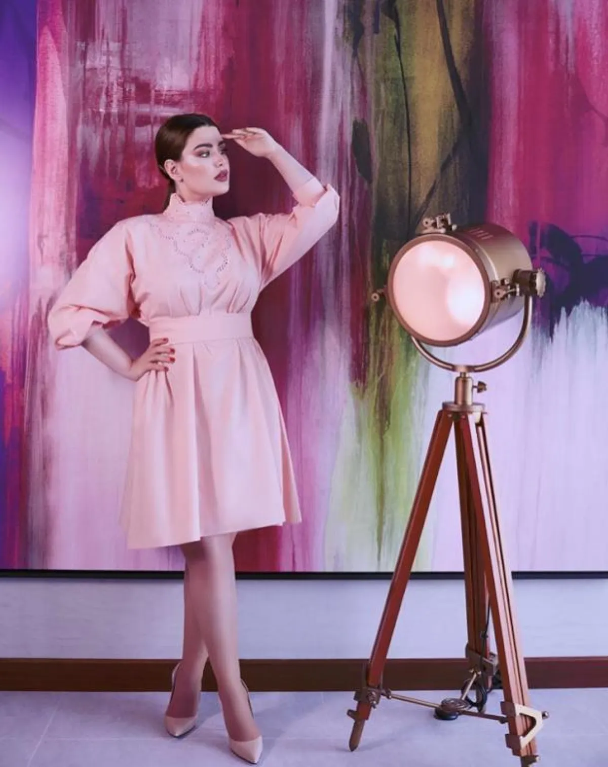 خلال جلسة تصوير، اختارت روان فستان ميدي باللون الوردي بأكمام تصل حد الكوع، وقبة عالية مزركشة، وحزامًا متوسط العرض على الخصر، نسقته مع حذاء برأس مدبب وكعب عالٍ، بلون الفستان نفسه، واختارت تسريحة ذيل الحصان المنخفضة وفرق في الوسط، لتظهر باطلالة أنثوية ناعمة جدًّا.