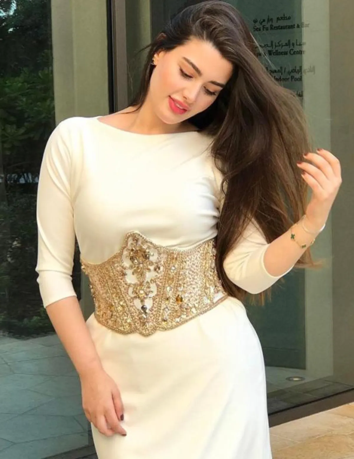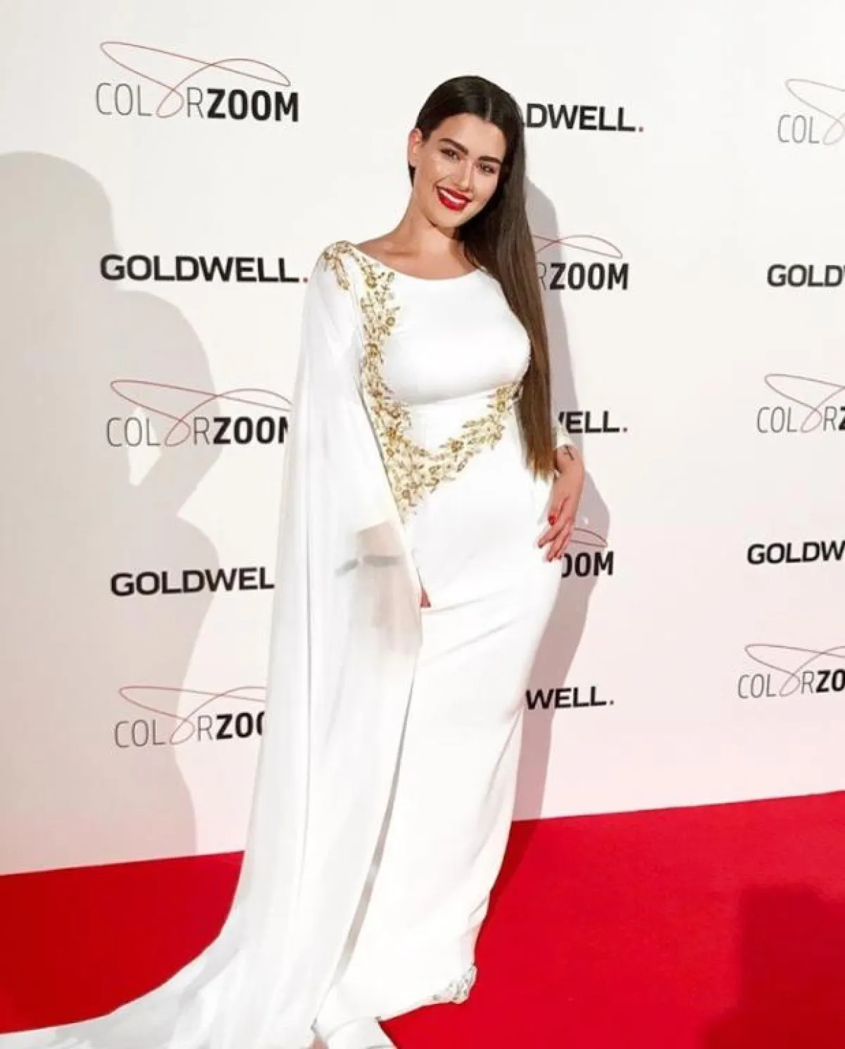 وللسجاة الحمراء اختارت روان فستانًا أبيض ماكسي، بقصة ضيقة، مطرزًا باللون الذهبي تطريزات ناعمة بعيدة عن البهرجة، بأكمام طويلة، واختارت أن يزيّن الفستان كايب من الشيفون الأبيض، ليكسر من القصة الضيّقة للفستان، فيحافظ على جمال الاطلالة، كون قوامها يميل إلى الامتلاء، وتسريحة شعرها ناعمة وطبيعية مع ماكياج ناعم وأحمر شفاه باللون الأحمر، لوك ناعم ولافت ناسب قوام المدونة روان.