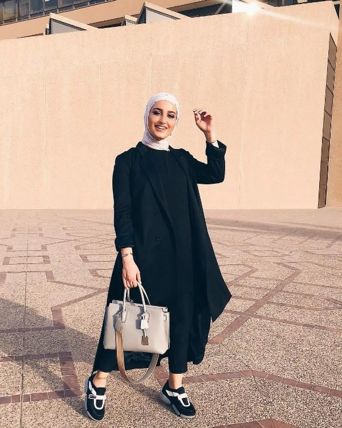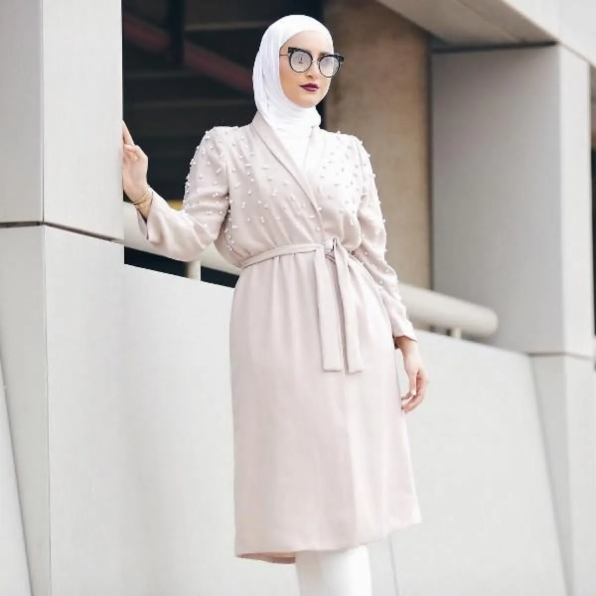 أما المدونة الكويتية دلال الدب، فذهبت إلى تصميم ناعم من المعطف الصيفي، يخلو من أي تفاصيل سوى حبات اللؤلؤ البيضاء التي زينت المعطف الوردي، كما نسقته مع بنطلون أبيض؛ لتخرج بإطلالة ملائكية، ننصح أي محجبة باعتمادها فورًا.