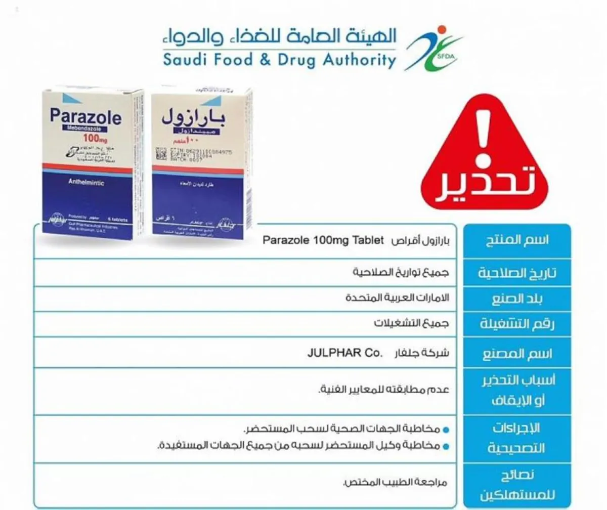 أعلنت الهيئة العامة للغذاء والدواء عن سحب مستحضر بارازول PARAZOLE 100 MG TABLET، وذلك بسبب عدم مطابقته للمعايير الفنية.