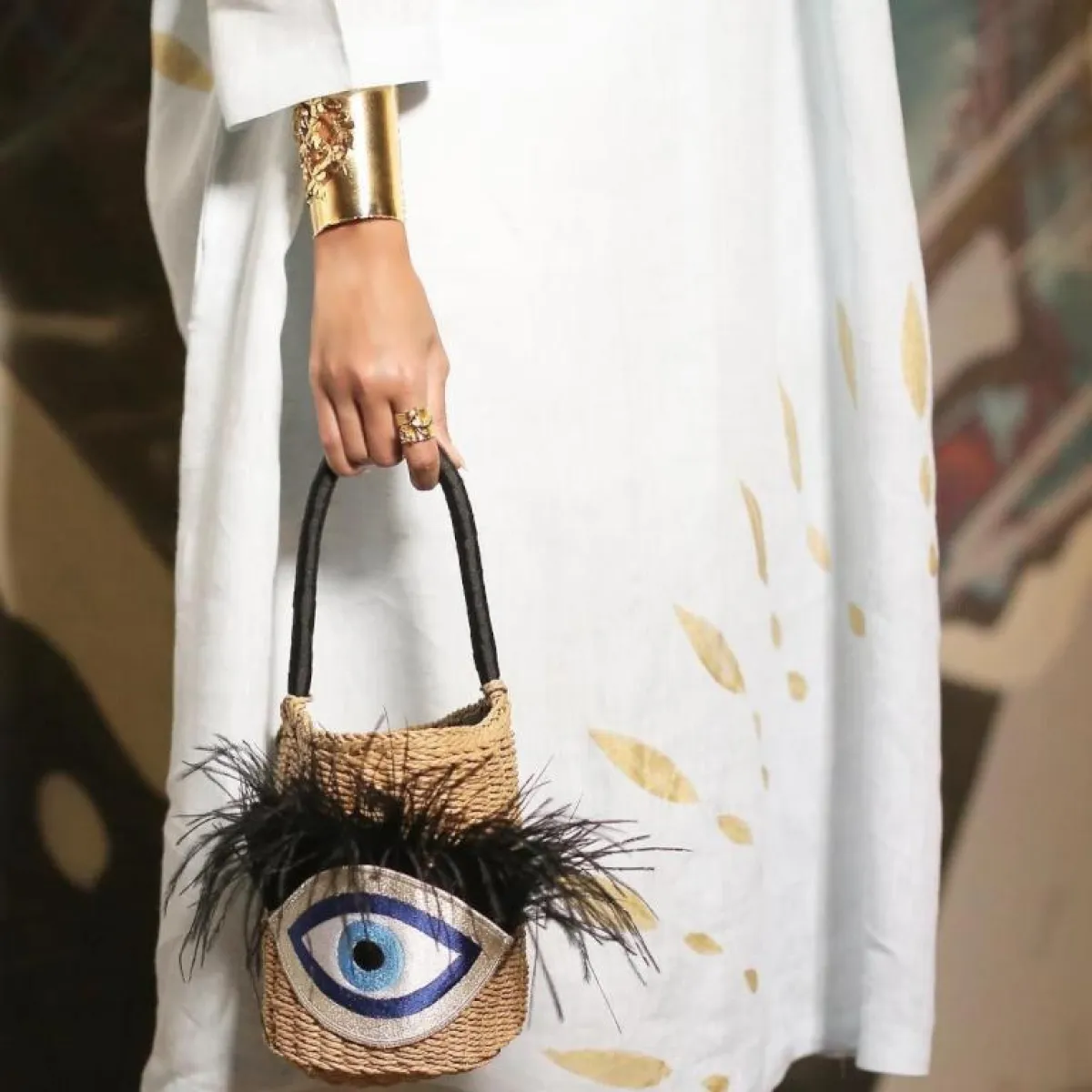 وبطريقة بعيدة تماماً عن جرأة كارن وازن، اختارت المدونة مرمر أن تنسق حقيبة القش مرصعة برسمة كبيرة للعين مع تونيك عصري بنفس النقوش، وبدت الإطلالة مميزة وعصرية تناسب الفتيات و النساء المحجبات.