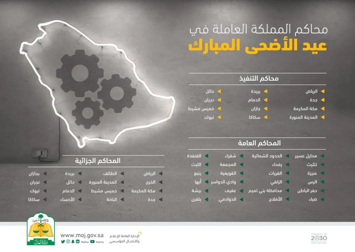 وأوضحت الوزارة أن المحاكم العامة العاملة في العيد هي: المحكمة العامة بمحافظة عفيف، القويعية، المجمعة، رفحاء، الحدود الشمالية، عنيزة، حفر الباطن، الأفلاج، القريات، وادي الدواسر، محايل عسير، الرس، الزلفي، ضباء، بلقرن، بيشة، الخرج، حوطة بني تميم، شقراء، الليث، ينبع، الدوادمي، وتثليث.