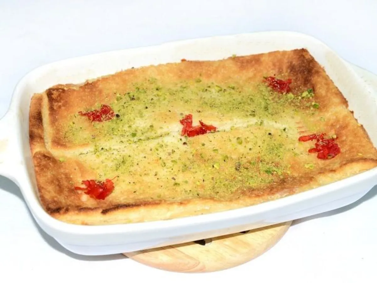 5- طريقة التقديم:يزيّن هذا الطبق بمربى زهر الليمون والفستق المبشور.ويقدّم ساخناً، أو بارداً.