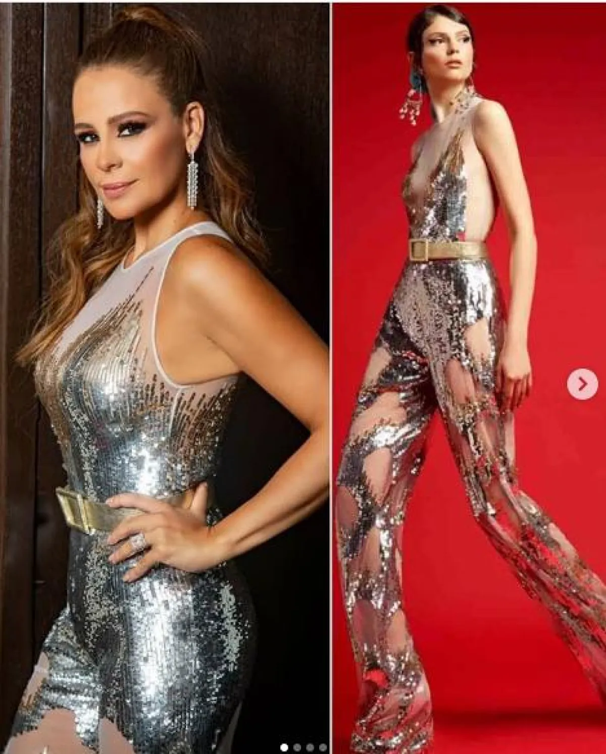 أما الاطلالة الثانية فكانت جمبسوت باللون الذهبي، وبكمّ واحد مطرز بالـ "الشراشيب" المنسدلة.