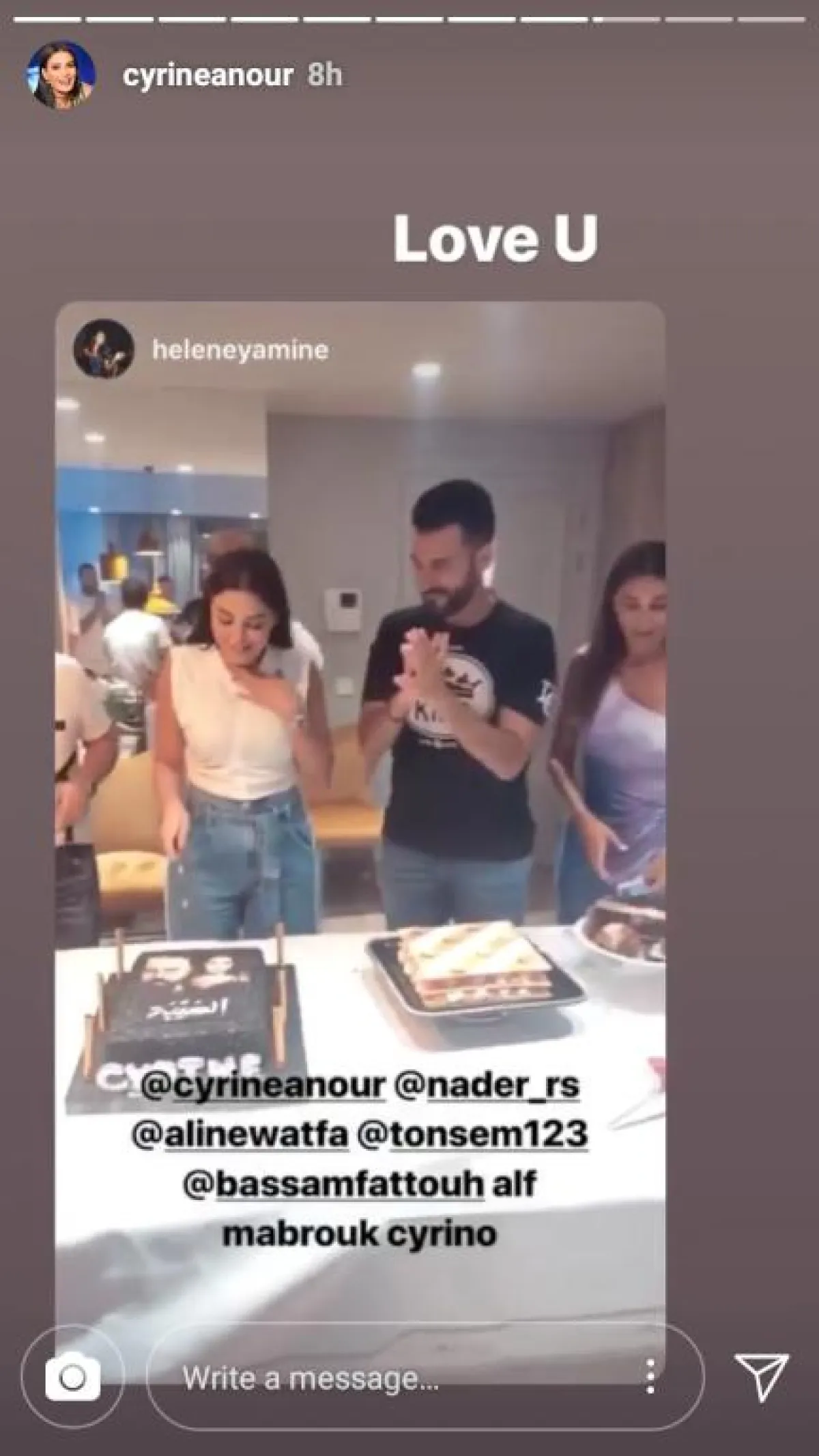 إحتفلت الفنانة سيرين عبد النور بإنضمامها إلى الجزء الثالث من مسلسل "الهيبة"، مع مجموعة من الأصدقاء من بينهم ألين وطفا والماكيير بسام فتوح.
