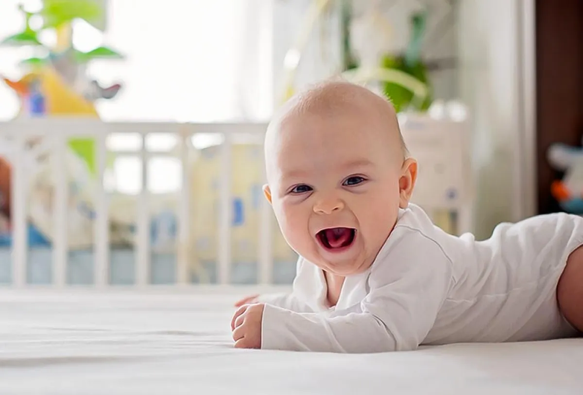 في عمر ستة أسابيع حيث يبتسم لأمه، ويتجشأ مع الابتسامة، وتأخر ابتسامة الطفل تكون بسبب مرضه واعتلال صحته.