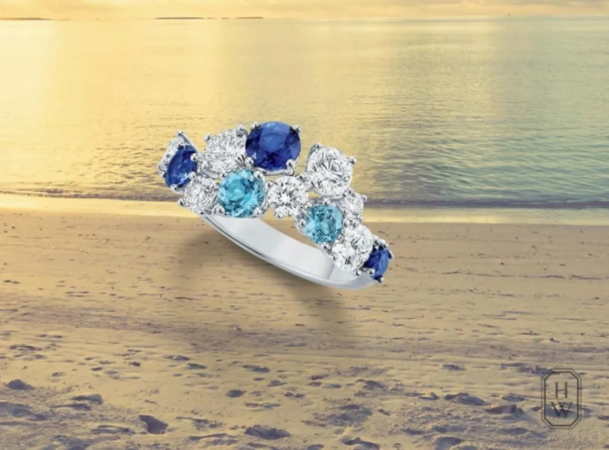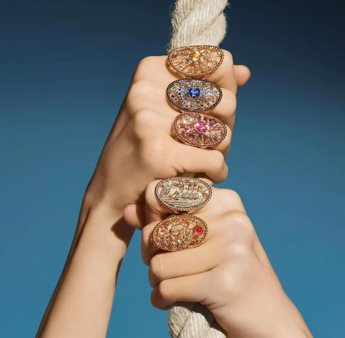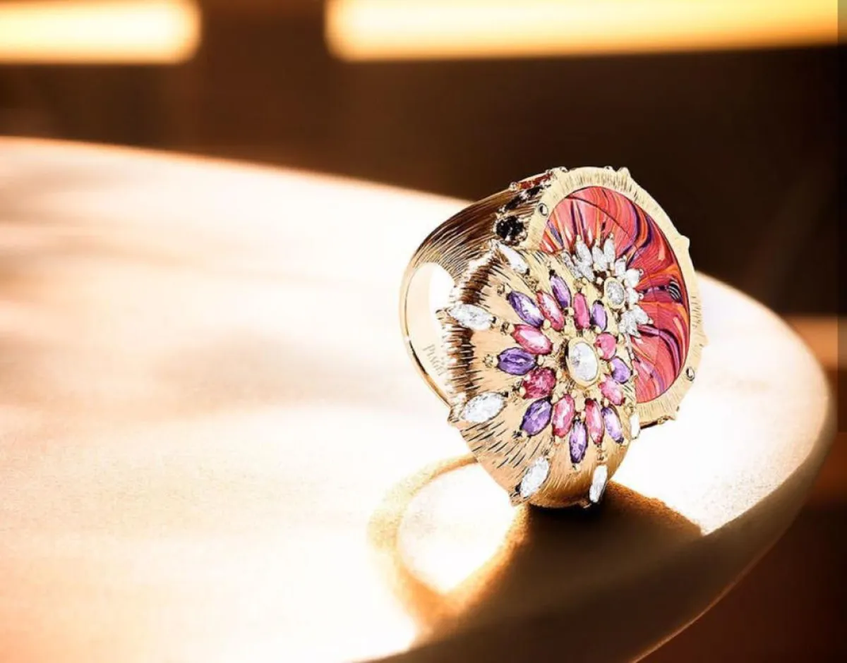 فعلى سبيل المثال، بإمكانك أن تختاري هذا الخاتم من مجموعة صانلايت جورني Sunlight Journey من بياجيه Piaget وهو مصنوع من الذهب الأصفر ومرصّع بالماس وأحجار السافير الملوّنة.