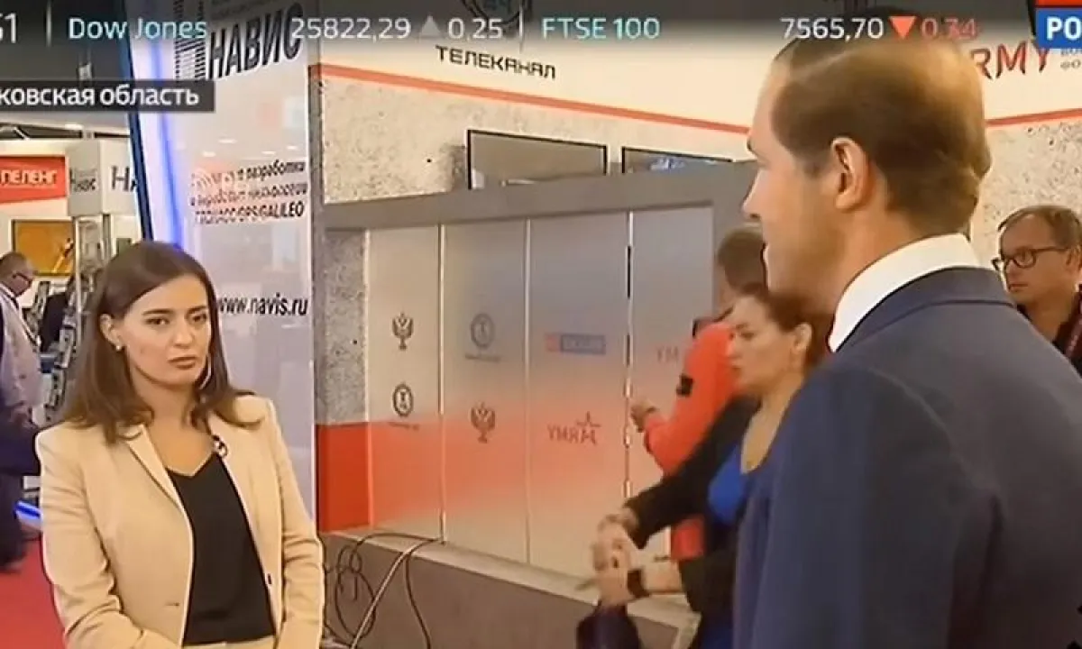 ويظهر في بداية المقطع وزير الصناعة والتجارة الروسي خلال إجابته عن سؤال وجهته المراسلة ومقدمة البرامج الإخبارية في قناة "روسيا 24" داريا كوزلوفا، وهي خارج الكادر.