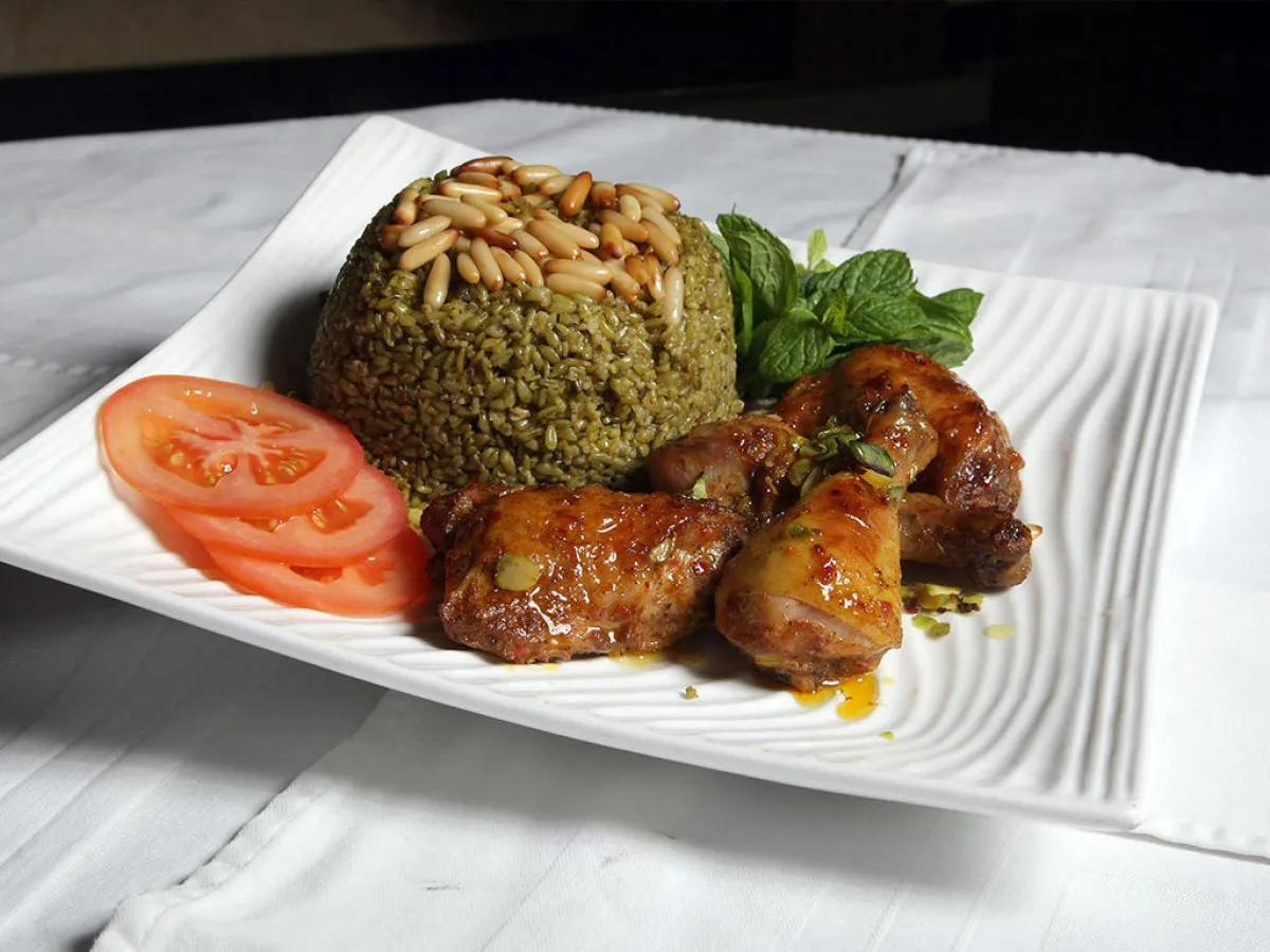 3ـ تسكب الفريكة في طبق التقديم، ويوضع فوقها الدجاج أو اللحم، وتزيّن بالصنوبر واللوز.