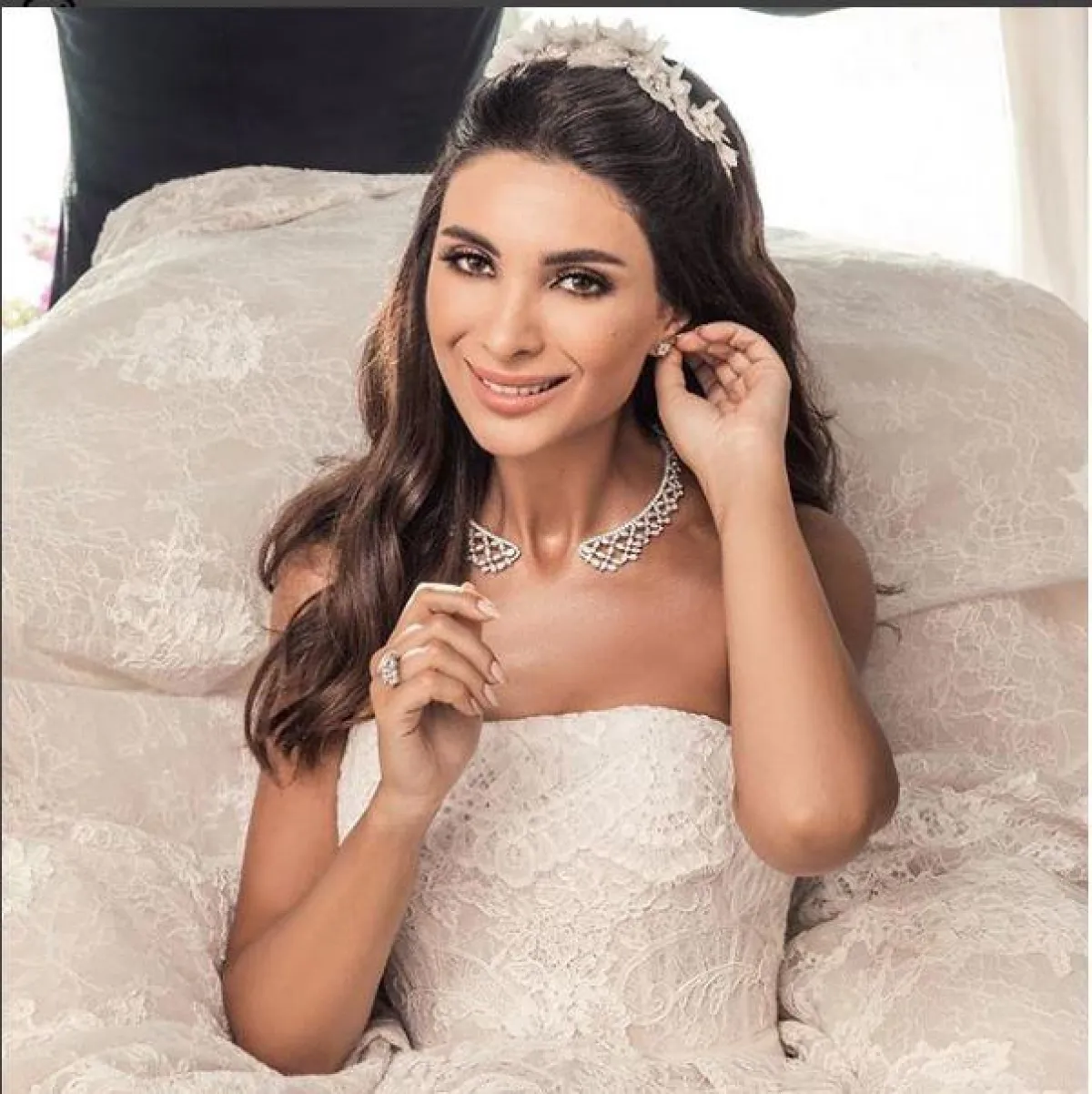 الإعلامية الشهيرة ألين وطفة، تعتبر هي أحد عروس على الساحة، أثار حفلها الكثير من الضجة بأناقة إطلالتها خاصة أنها مذيعة مختصة بالموضة، واعتمدت ألين على مجوهرات راقية وعصرية، حيث اختارت عقد ألماسي على شكل الياقة، مفتوح من المنتصف، ليناسب فستانها بتصميم الـ Strapless، ونسقت معه حلق بسيط عبارة عن الحجر فقط، وجاء خاتم الزفاف بنفس الفكرة، من توقيع دار Voyageur.