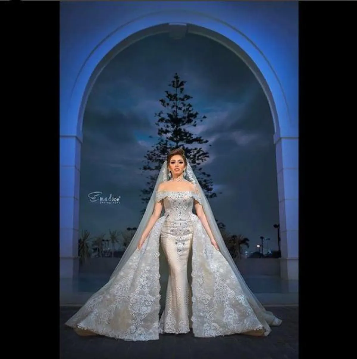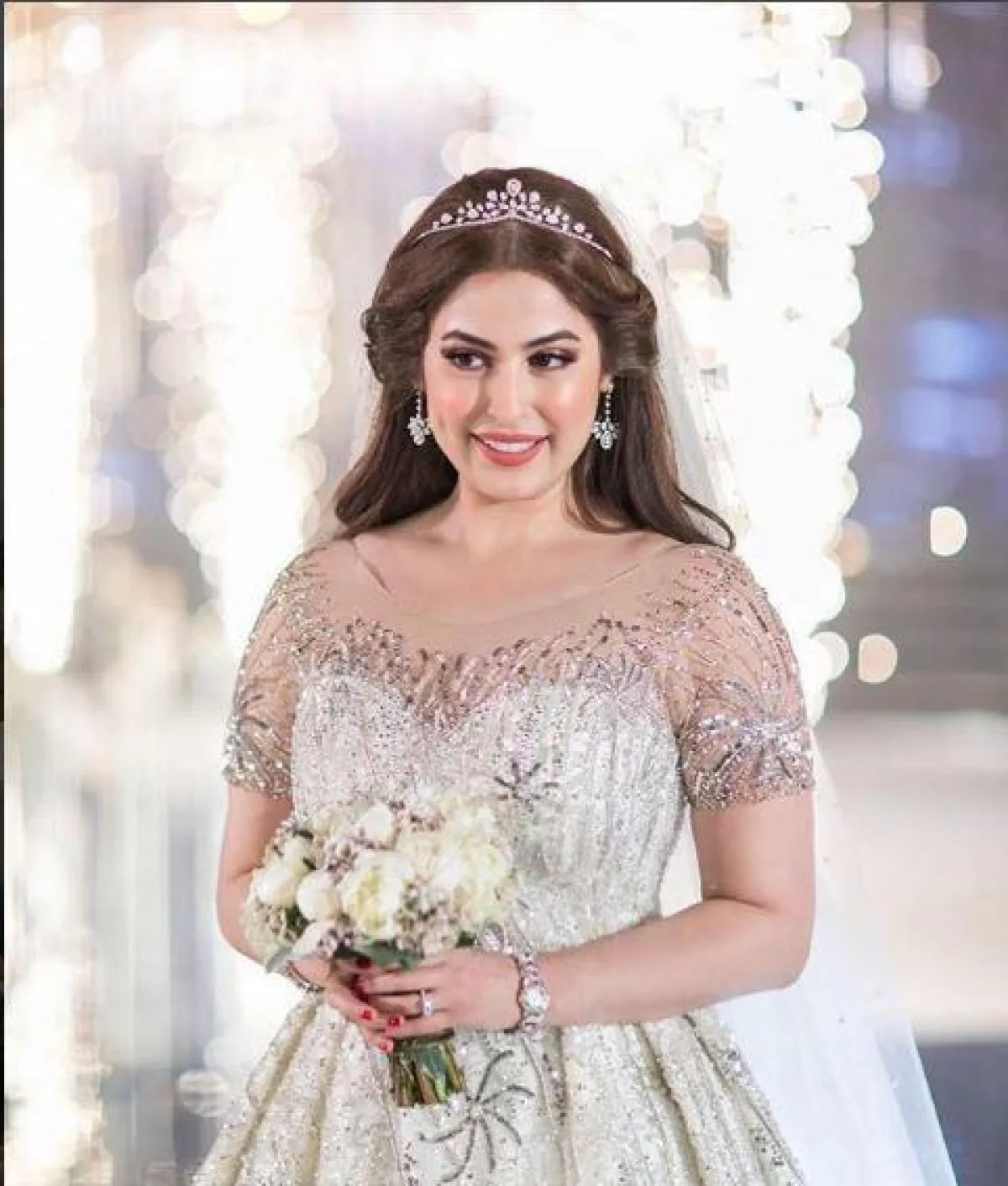 وبنفس الطريقة اعتمدت غدير السبتي على المجوهرات الكبيرة الحجم ولكنها كانت ضخمة أكثر، تناسب إطلالتها الملكية، بعقد مرصع بالاحجار من وصلتين، مع قرط أذن متدلي كبير الحجم، وجاء فستانها بأكمام الطويلة، اكتفت معه بالطرحة دون وضع التاج.