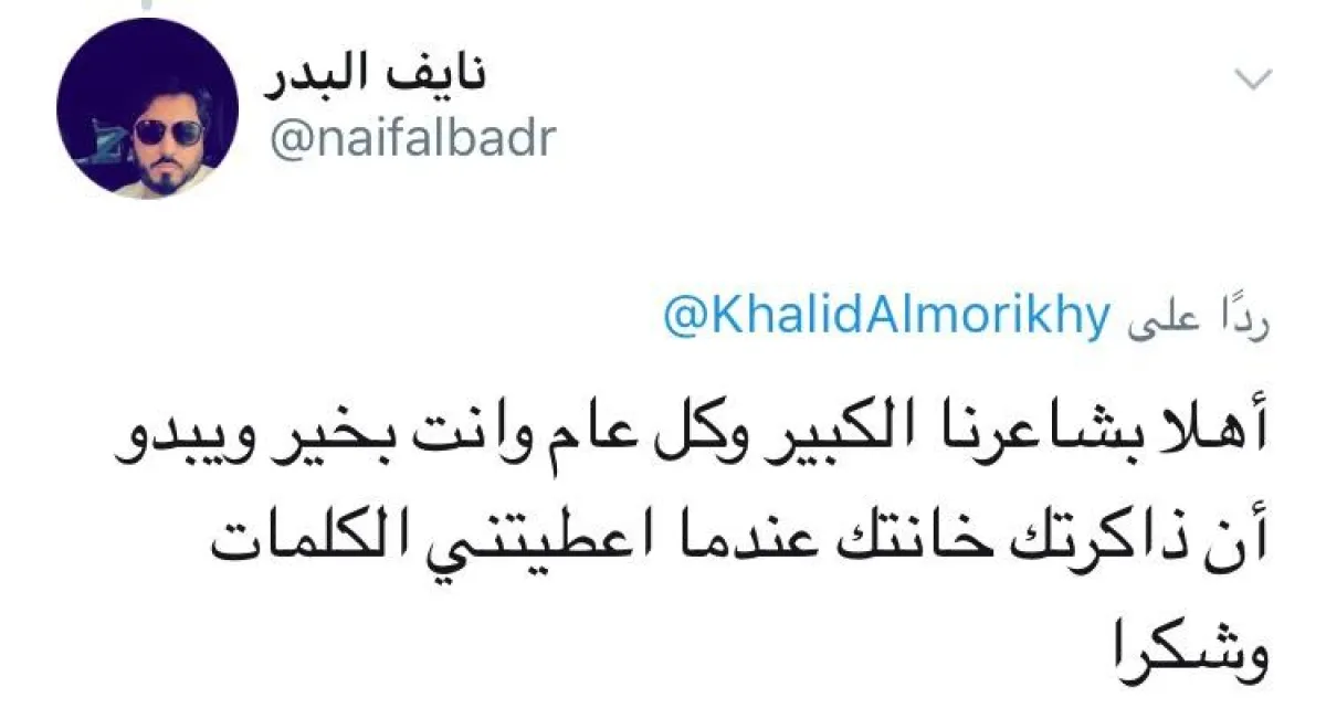 البدر ردَّ على التغريدة بأخرى، أوضح فيها حقيقة الموقف، قائلًا: "أهلًا بشاعرنا الكبير، وكل عام وأنت بخير. يبدو أنّ ذاكرتك خانتك، فقد أعطيتني الكلمات وشكرًا".