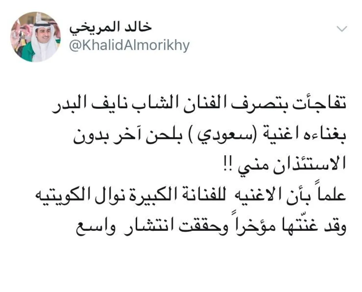وردًّا على ذلك، أطلق الشاعر خالد المريخي تغريدة، وبَّخ فيها الفنان نايف البدر، مشيرًا إلى أنّ الأغنية للفنانة نوال الكويتية، طالبًا من البدر الاستئذان منه قبل غنائها، كونه كاتبها، قائلًا: "تفاجأت بتصرف الفنان الشاب نايف البدر بأدائه أغنية "سعودي" بلحن آخر، من دون الاستئذان مني! علمًا أنّ الأغنية هي للفنانة الكبيرة نوال الكويتية، وقد غنَّتها مؤخرًا، وحققت انتشارًا واسعًا".