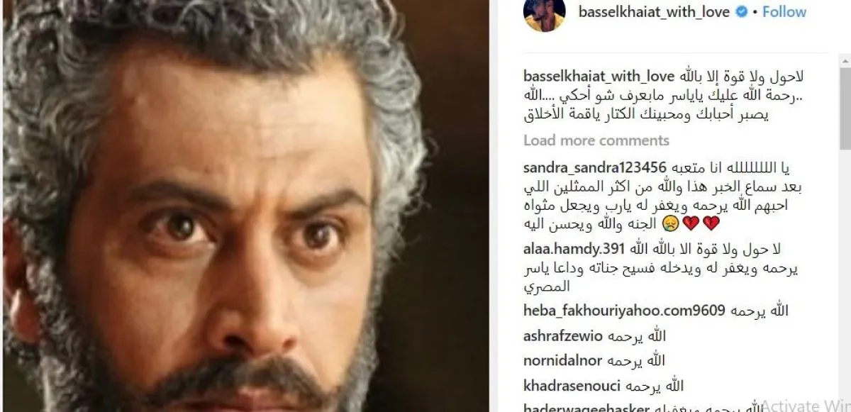 أما الفنان باسل خياط فنعاه عبر انستقرام بقوله: "لا حول ولا قوة إلا بالله..رحمة الله عليك يا ياسر، ما بعرف شو أحكي..الله يصبّر أحبابك ومحبينك الكتار يا قمة الأخلاق".