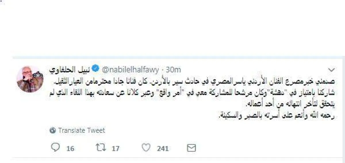 ونعت صابرين، المصري بهذه الكلمات عبر تويتر :"إنّا لله وإنّا إليه راجعون، الله يرحمك، عزاؤنا لشعب الاْردن الشقيق وللوطن العربي الزميل الفنان ياسرالمصري الخلوق المحترم، وندعو لنا ولأسرته الصبر والسلوان".