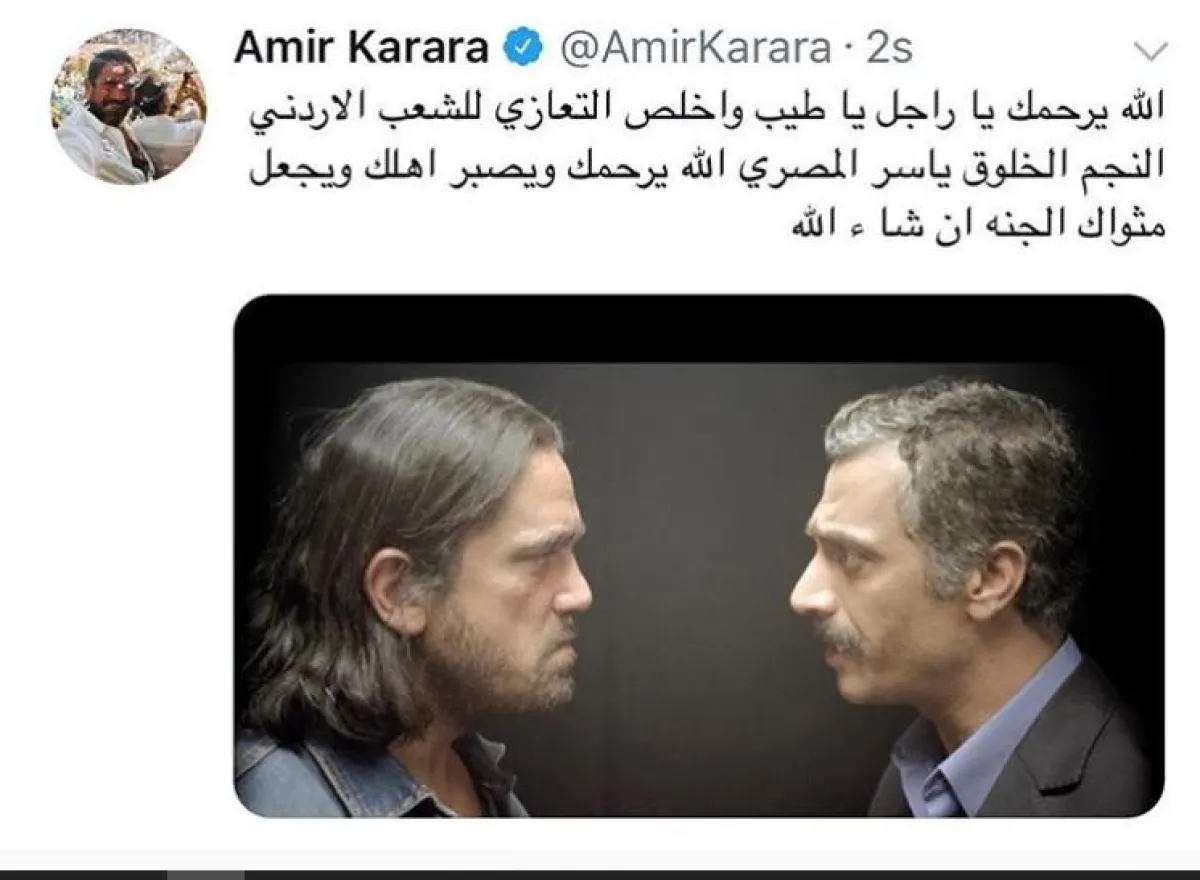 فيما نشر عمرو يوسف صورة للفنان الراحل، وعلّق عليها قائلًا: "اللهمّ ارحمه وثبّته عند السؤال، الفنان الخلوق ياسر المصري في ذمة الله، إنّا لله وإنّا إليه راجعون".