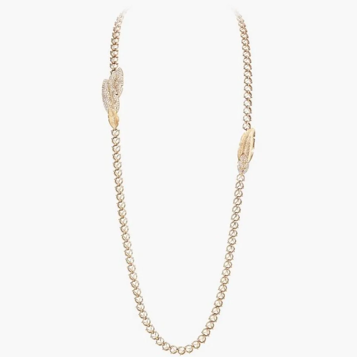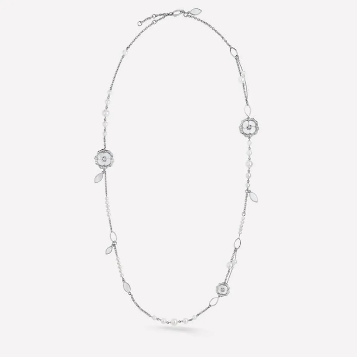 ومن دار شانيل CHANEL العريقة، اخترنا لك عقد من مجموعة كاميليا Camelia وهو عقد رغم شكله الناعم، يتمتع بتصميم معقّد بعض الشيء. دخل في صياغته الذهب الأبيض وأحجار اللؤلؤ الناصعة البياض وحجر أم اللآلئ، بالإضافة إلى بعض حبيبات الماس الناعمة. هو تصميم لا يليق الا بالمناسبات الفاخرة.