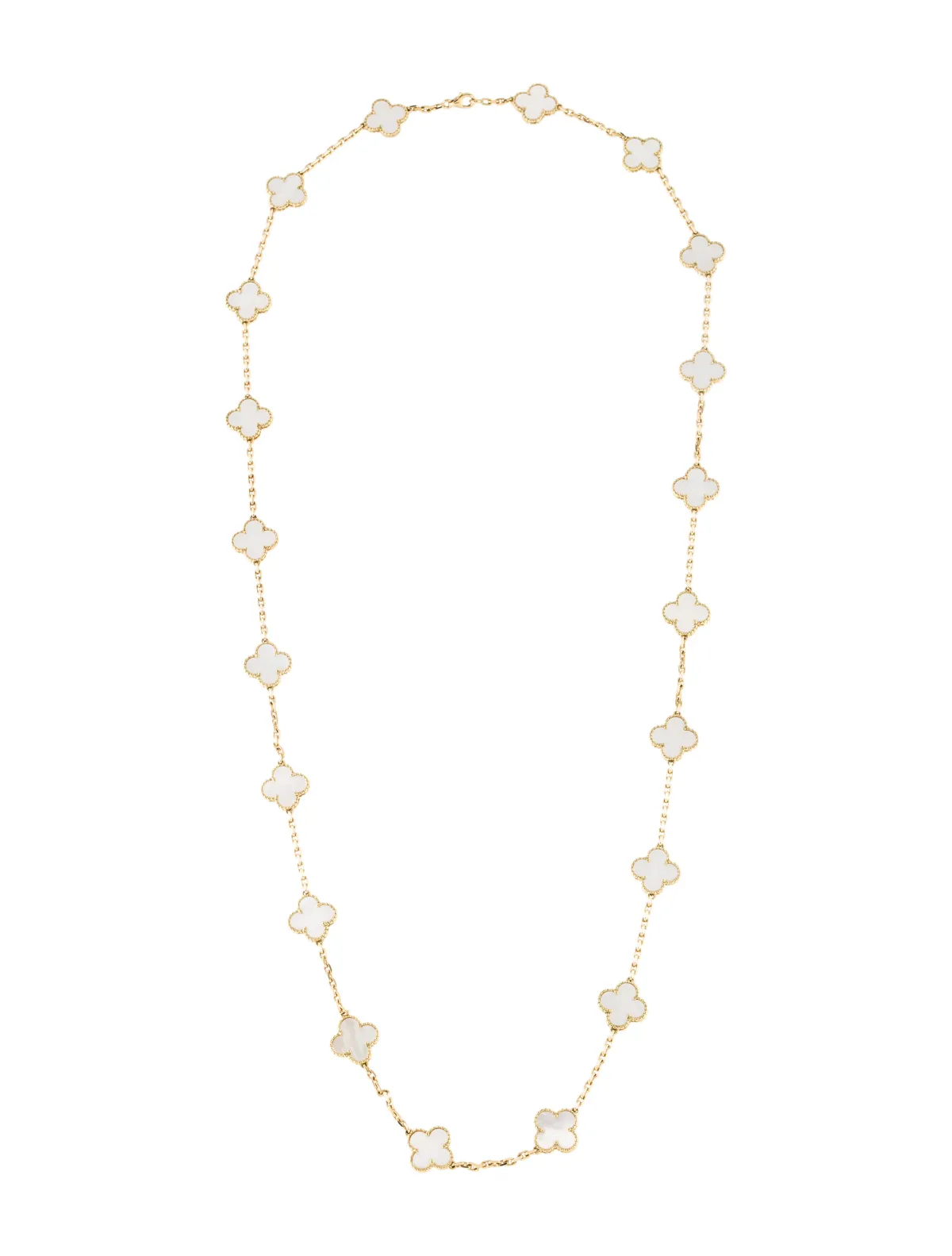 كذلك اخترنا لك عقد سوتوار من من مجموعة فينتيدج الهامبرا Vintage Alhambra من فان كليف أند أربلز Van Cleef&Arpels وهو عقد بتصميم واضح مصنوع من الذهب الأصفر ومرصع بحجر أم اللآلئ الصافي. عقد ناعم يناسب إطلالات النهار كما يصلح لتزيّني به إطلالتك المسائية خلال عشاء عائلي.