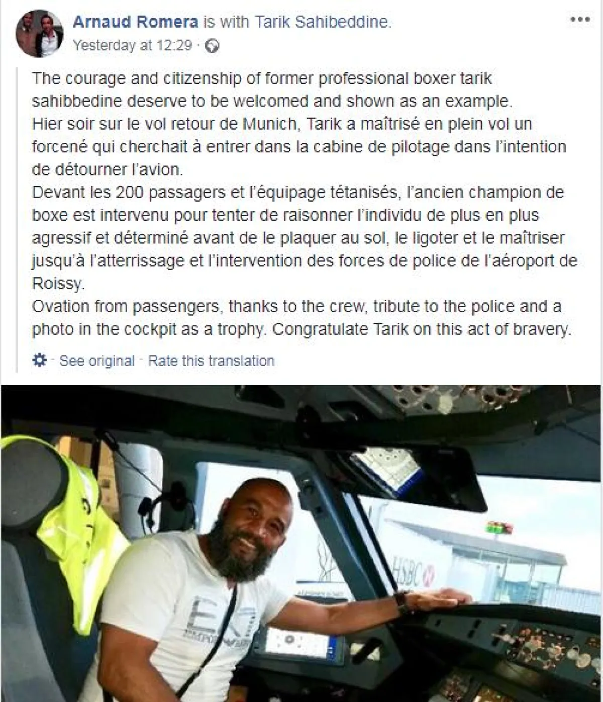 وكان الصحفي الفرنسي «أرنو روميرا»، قد نشر تفاصيل هذه الحادثة على حسابه الشخصي في موقع التواصل الاجتماعي «فيسبوك»، وذكر أن ما قام به الملاكم الفرنسي مغربي الأصل وبطل فرنسا مرتين في الوزن الخفيف ووزن الريشة، بأنه «شجاعة حقيقية»، وجاء في منشور الصحفي «روميرا»: «أمام 200 من الركاب وأفراد الطاقم المشلولين بلا حراك، تدخَّل بطل الملاكمة السابق محاولاً السيطرة على الشخص الذي كان يزداد عدوانية أكثر فأكثر، قبل أن يطرحه أرضاً ويسيطر عليه، ريثما هبطت الطائرة وتدخَّلت قوات الشرطة في المطار».