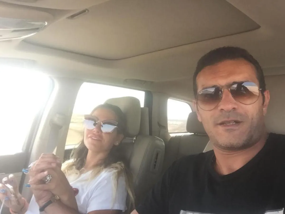 في الصورة تظهر منة بإطلالة شبابية يغلب عليها اللون الأبيض وهي تمسك بيد زوجها داخل السيارة بينما يرتدي طارق اللون الأسود.
