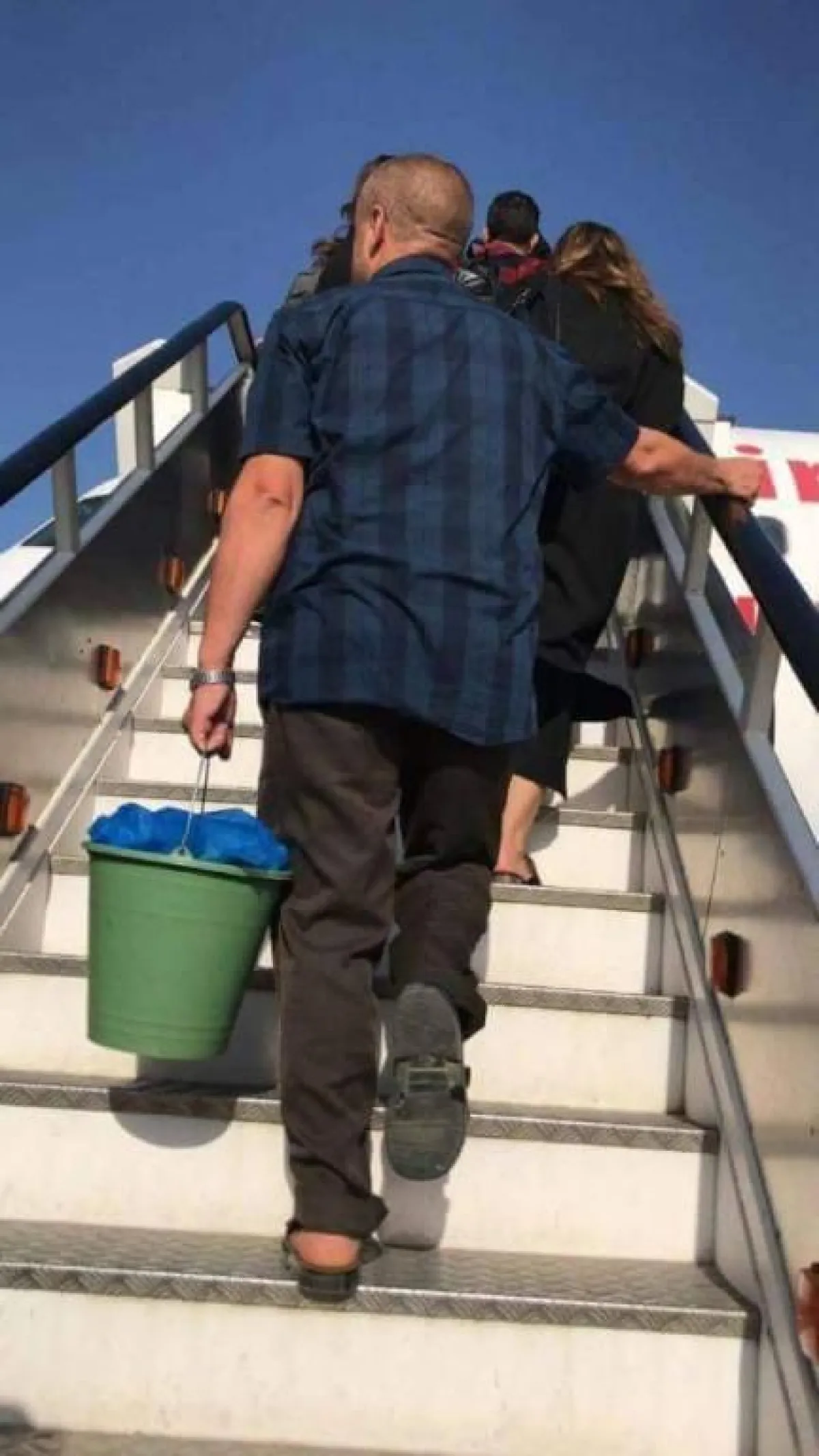 تداولت مواقع التّواصل الاجتماعي اليوم في تونس صورة طريفة لرجل يصعد سلّم الدخول إلى الطائرة وهو يحمل في يده سطلاً بلاستيكيّا.
