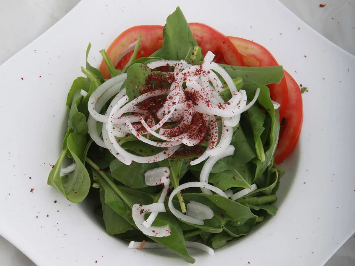 2 ـ يوضع هذا الخليط في طبق التقديم، يُضاف إليه البصل المقطّع إلى جوانح، ويزّين بشرائح البندورة، ثمّ يُنثر السمّاق.