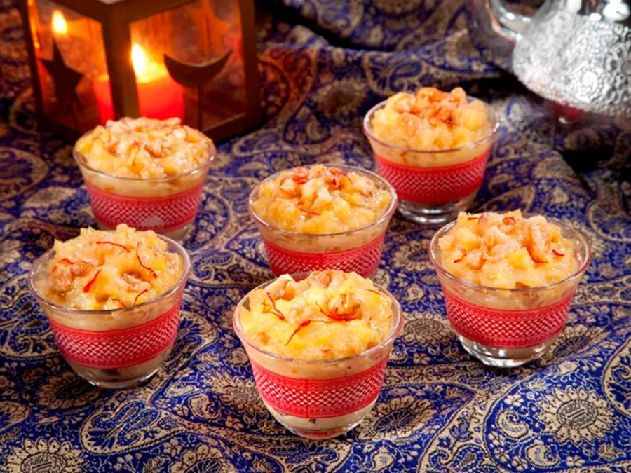 7-اسكبي عصيدة الدبس الساخنة في الأطباق. وزّعي الفستق . قدّمي عصيدة الدبس ساخنة أو حسب الرغبة.