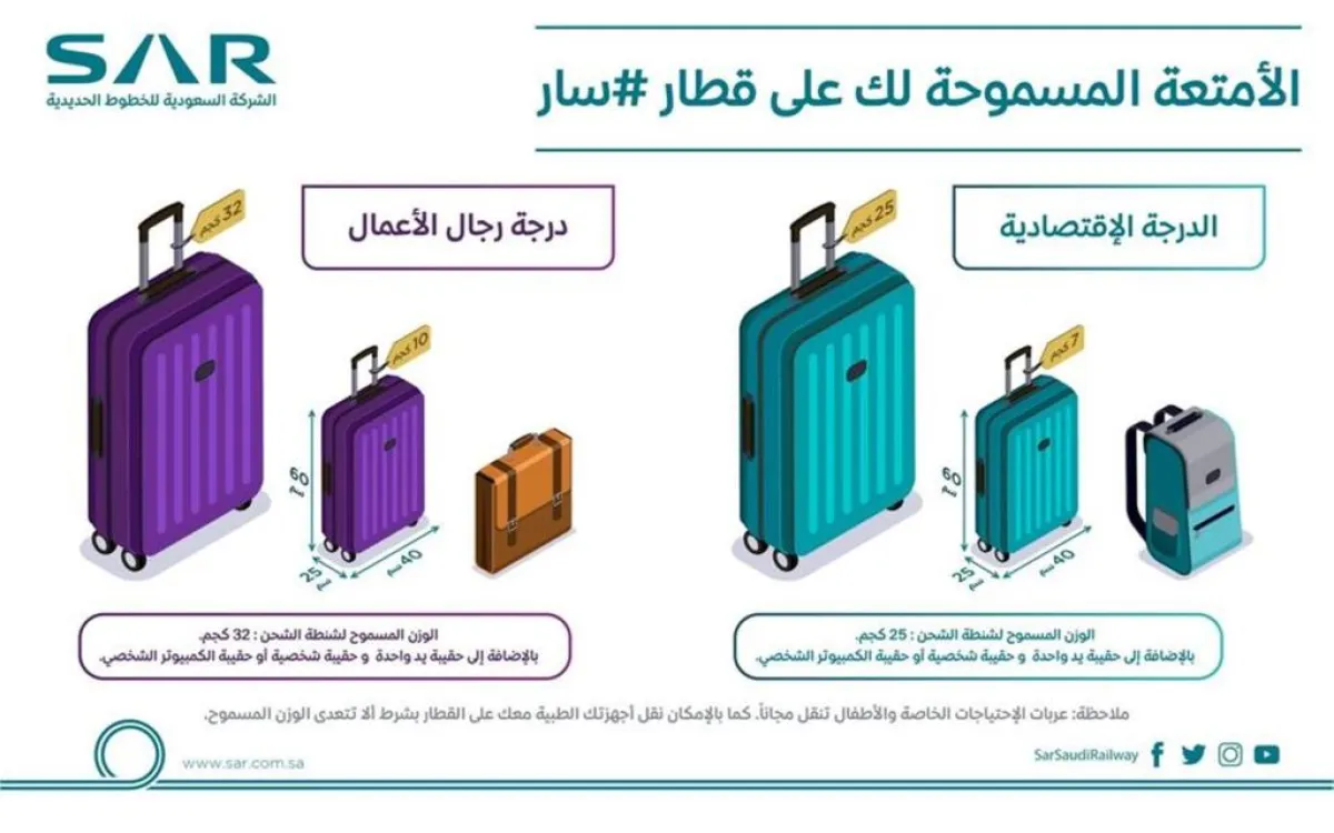 كشفت الشركة السعودية للسكك الحديدية «سار»، عن الأوزان المسموح بها لركاب قطارات الشركة من ركاب الدرجة «الاقتصادية» ودرجة «رجال الأعمال».