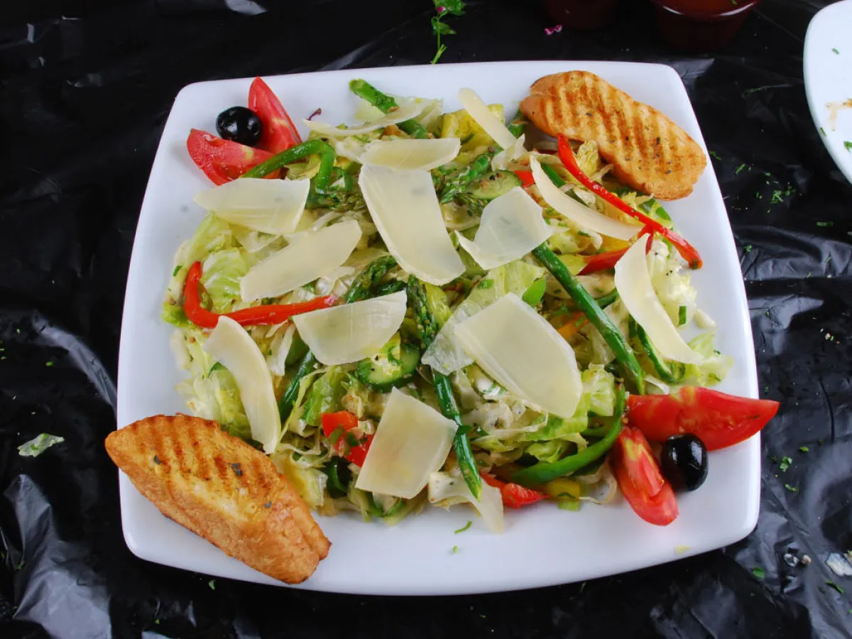 1-اغسلي الخسّ والكبدچ والسباراجوس جيّداً بالماء، ثمّ قطعي المكوّنات إلى شرائح، وضعي الخيار معها والملح والزيت وعصير الليمون، ثمّ قلّبي الخليط جيداً، ثمّ ضعيه على طبق التحضير، ثمّ ضعي قطع جبن البارميزان وجودا على الوجه، ثمّ ضعي على حوافّ الطبق شرائح الطماطم والزيتون وشرائح التوست.