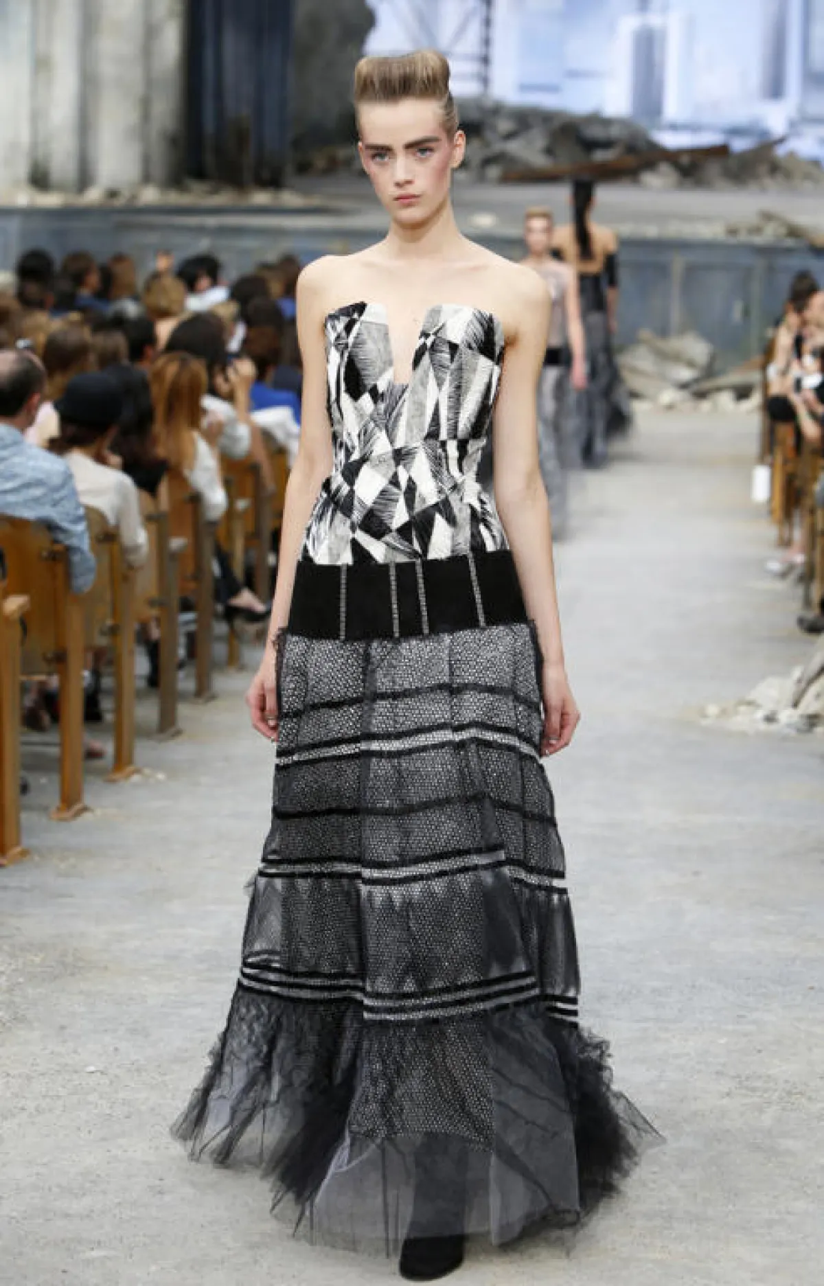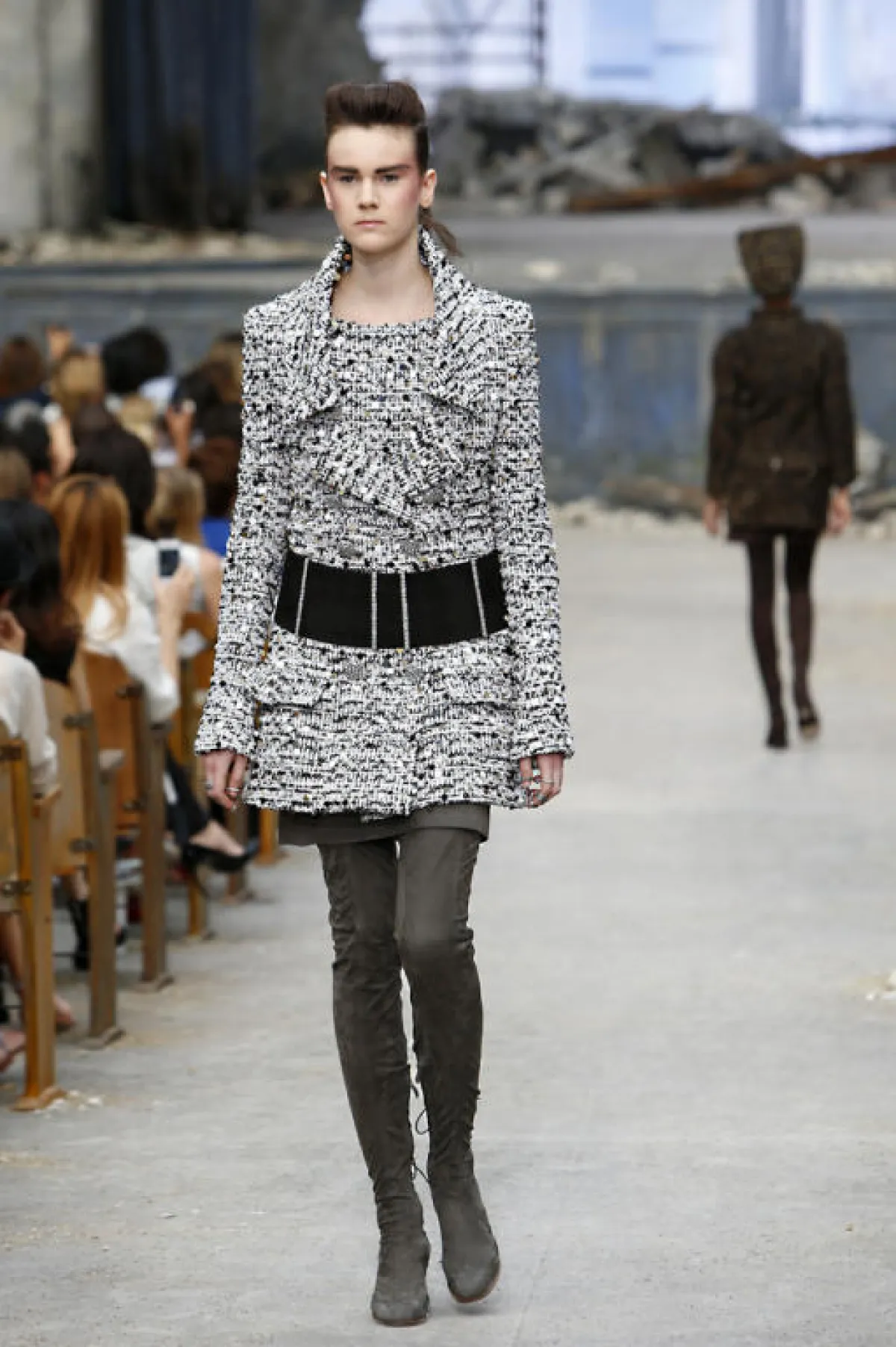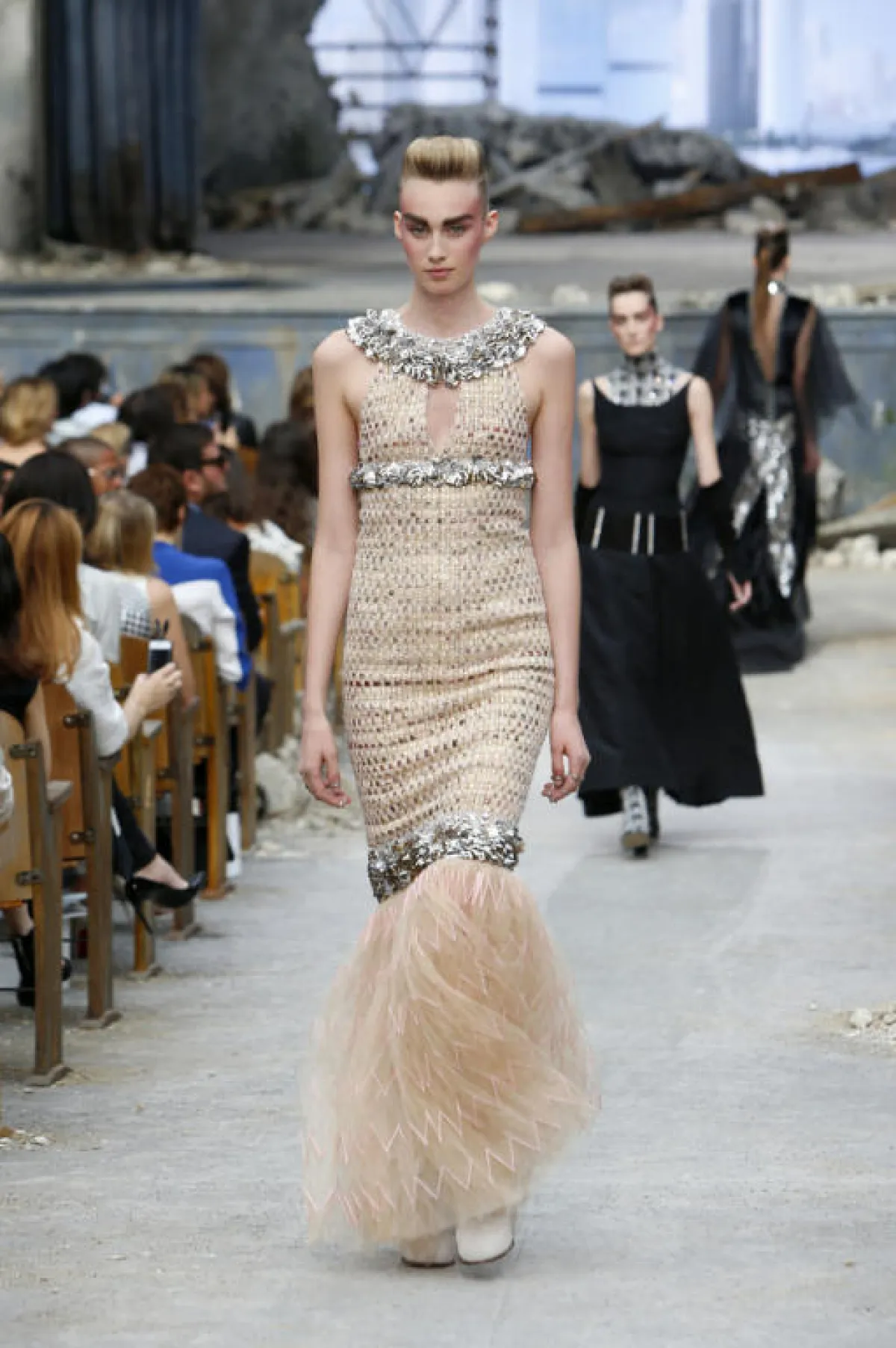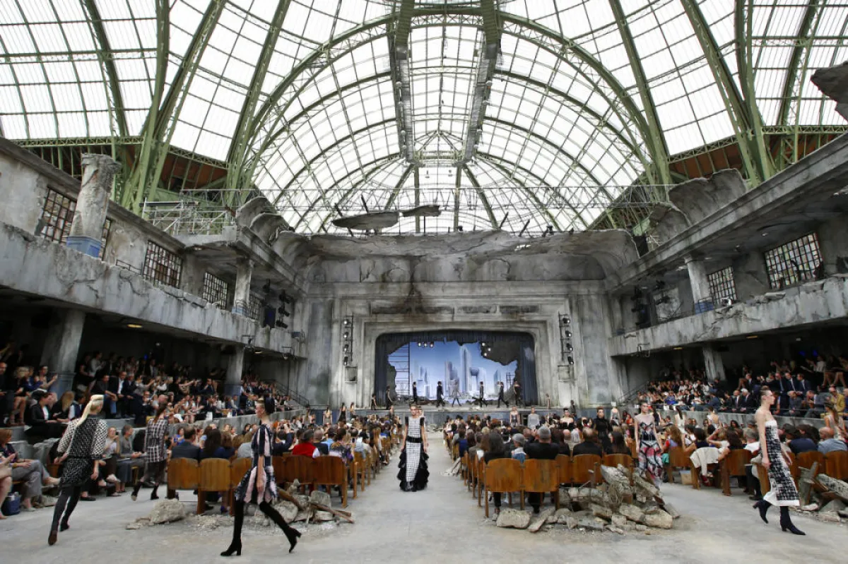 بعد الكرة الأرضية العملاقة التي توسّطت عرضه في شهر مارس الماضي, اختار لاغرفيلد مصمّمُ دار Chanel، هذه المرة، أجواء قصر مهجور ليعرض مجموعة الكوتور الخاصّة بخريف و شتاء 2013-2014 بحضور النجمتين ريهانا و هيفاء وهبي. و لكنّ الركام الذي غطّى أرض المكان، والجدران التي تساقطت أجزاء منها، لم تستطع أن تخفف من بريق المدينة الجديدة التي ظهرت كخلفيّة للعرض، ولا من أناقة العارضات اللواتي سرن بخطى عسكريّة وارتدين أزياء من التويد بألوان محايدة.